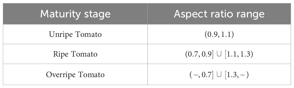 This study presents a tomato maturity assessment method utilizing shape characteristics. The tomato size is first derived from the GAE-YOLO detection bounding box, followed by preliminary maturity estimation through aspect ratio calculation (Equation 14). While this approach demonstrates high computational efficiency, its accuracy is somewhat limited, making it particularly suitable for large-scale cultivation scenarios. The threshold for judging tomato shape maturity is presented in Table 4.