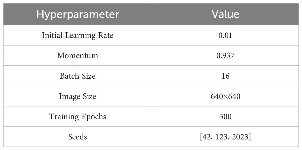 The Model training and development configuration for this study is configured as follows: CPU: Intel (R) Core (TM) i9-13900H, RAM: 32GB, GPU: NVIDIA GeForce RTX 4060 with 8GB of video memory. The framework environment is built on PyTorch 2.5.1, with Python version 3.9.21 (running on Windows 11), CUDA version 12.1, and CUDNN version 9.0.0. All experiments were conducted with uniform parameter settings, and the specific hyperparameters are listed in Table 5.
