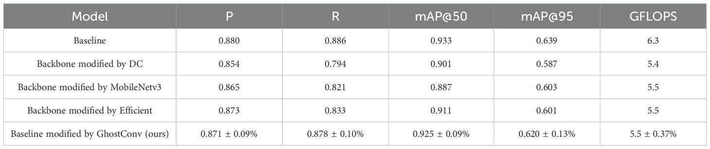 This study establishes model lightweighting as the primary objective and conducts a systematic evaluation of mainstream lightweight architectures for tomato detection tasks. Using the standard YOLOv11 as the baseline model, the most representative lightweight network architectures were selected for comparative analysis. The YOLOv11 backbone was modified by implementing depthwise separable convolution and its derivative architectures, including MobileNetV3 and EfficientNet. Through controlled experiments, the performance of each model was rigorously compared and analyzed across key dimensions: precision, recall, mAP, GFLOPS. The architectural exploration led to a key revelation: the GhostConv-based modification proved to be an optimal strategy, successfully maintaining high detection accuracy (mAP@50 = 93.5%) while reducing computational complexity by 12.6% to 5.5 GFLOPS compared to the baseline. Importantly, under comparable computational constraints, GAE-YOLO consistently surpassed all other benchmarked models, an outcome that solidifies its status as the most effective solution evaluated. These findings conclusively validate the technical advantages of GAE-YOLO for agricultural edge computing applications. The detailed results are presented in Table 6.