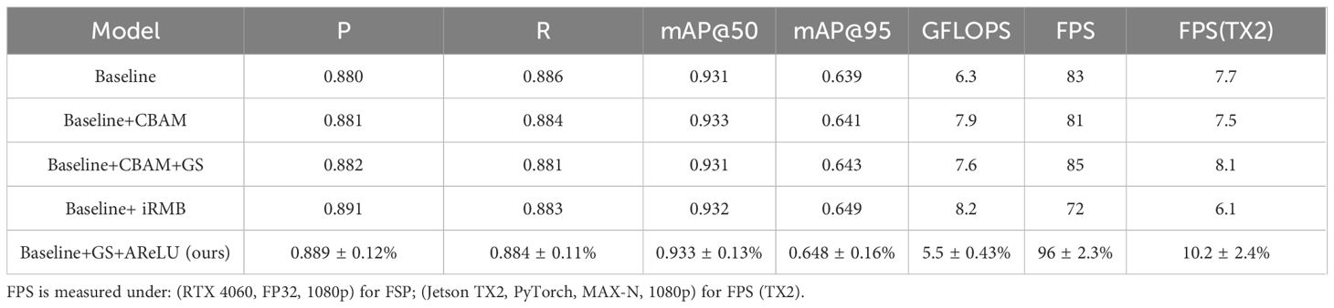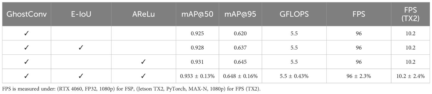 Table 8 presents a systematic ablation study of the GAE-YOLO model, evaluating the individual contributions and synergistic effects of each enhancement module through controlled experiments. The experimental design follows a progressive integration strategy, sequentially incorporating three core modules: GhostConv, E-IoU, and AReLU (where “✓” denotes module inclusion). As the foundational lightweight component, GhostConv achieves 0.925 mAP@50 and 0.620 mAP@95 while maintaining high-speed performance of 96 FPS (GPU 4060) and 10.2 FPS (TX2). The addition of the E-IoU loss function yields a 2.7% improvement in mAP@95, demonstrating significant enhancement in bounding box regression precision. When integrated with the AReLU activation function, mAP@95 further increases by 4.0%, validating the efficacy of the adaptive feature activation mechanism. The complete model combining all three modules achieves optimal performance (0.933 mAP@50 and 0.648 mAP@95), representing improvements of 0.8% and 4.5% over the baseline, respectively, without additional computational overhead. Consistent GFLOPS and FPS metrics across all experimental groups confirm that the proposed enhancements achieve performance gains at minimal computational cost. On the TX2 edge device, the full model maintains real-time processing at 10.2 FPS under a 1080p resolution without TensorRT optimization, demonstrating the baseline performance and satisfying deployment requirements for practical agricultural applications.