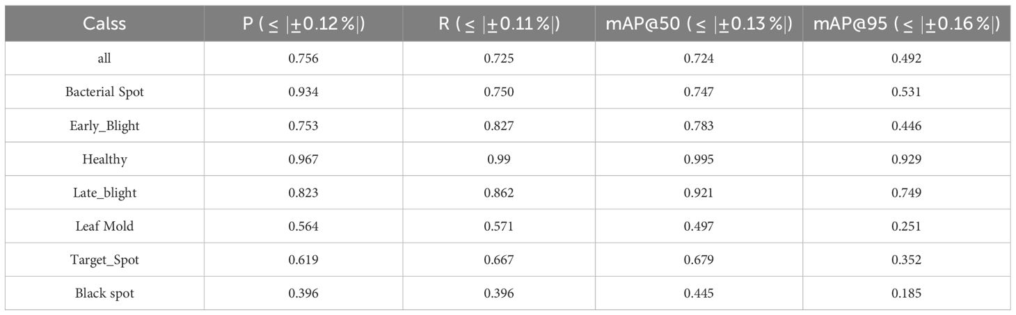 The significant performance variation across disease categories, as detailed in Table 9, warrants further analysis. Diseases like Black Spot and Leaf Mold present particular challenges primarily due to their subtle and irregular visual characteristics. In early stages, Black Spot lesions are small, dark, and lack a defined shape, making them difficult to distinguish from shadows or soil splashes. Similarly, Leaf Mold often manifests as diffuse, chlorotic areas with low color contrast against the healthy green leaf background, confounding the model. These challenges are compounded by two factors: (1) Intra-class variability, where the appearance of a single disease can vary significantly, and (2) Inter-class similarity, where early symptoms of different diseases can be visually analogous. The substantial gap between the mAP@50 and mAP@95 metrics further underscores the model’s difficulty in achieving precise pixel-level localization for these complex, non-uniform lesions. This difficulty is reflected in the large mAP@50–95 gap, highlighting a struggle with precise lesion localization. To address this, future work should prioritize enhanced multi-scale feature fusion to capture both minute spots and broad discolorations, alongside class-balanced training strategies to directly counteract data imbalance. Incorporating attention mechanisms also presents a promising path for improving focus on these subtle, critical features.