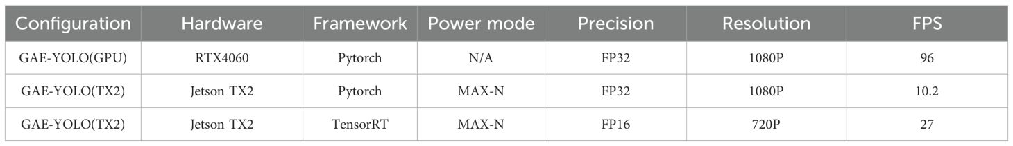 The GAE-YOLO model trained on RTX 4060 was converted into an optimized inference engine for TX2 using TensorRT, significantly improving execution speed while reducing resource consumption. The PyTorch model was first exported to ONNX format to ensure full operator compatibility with TensorRT. The ONNX model was then loaded and optimized using TensorRT tools on TX2 to generate the final engine file. By strategically distributing computational tasks across TX2’s GPU, DLA, and CPU, maximum resource utilization was achieved.