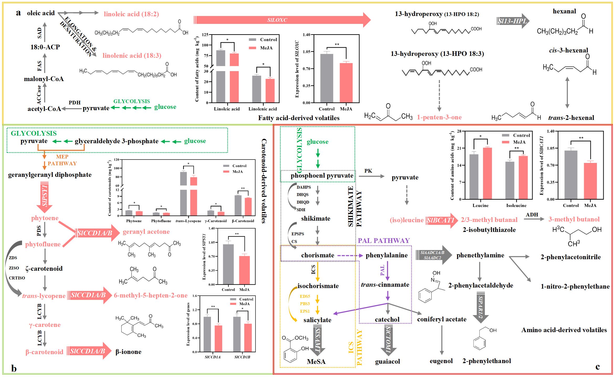 Figure 1. Impact of exogenous MeJA fumigation at breaker stage on the metabolism of six key volatiles in the red ‘FL 47’ tomato. (a) Fatty acid-derive volatile (1-penten-3-one). 1-penten-3-one is derived from linoleic and linolenic acids by the actions of SlLOXC (Shen et al., 2014). (b) Apocarotenoid volatiles (6-methyl-5-hepten-2-one and geranyl acetone). 6-methyl-5-hepten-2-one and geranyl acetone come from trans-lycopene and phytoene (or phytofluene), respectively, by the actions of SlCCD1A/B (Jia et al., 2023); and SlPSY1 is the key enzyme responsible for carotenoid biosynthesis (Wang et al., 2016). (c) Amino acid-derived volatiles (2-methyl butanal and 3-methyl butanal/ol). The formation of 2-methyl butanal and 3-methyl butanal/ol, which were derived from (iso)leucine, was initiated by SlBCAT1 (Klee, 2010; Maloney et al., 2010). ‘FL 47’ tomato at breaker stage were treated with MeJA or H2O (control) for 24 h prior to ripening at 20°C; fruit were sampled at the same time when the control and MeJA-treated fruits turned red. The expression level of each gene in the control fruit was set as 1.0 based on qRT-PCR result. Data represent means ± standard deviation (SD) from three biological replicates; and significant differences (*p < 0.05; **p < 0.01) were determined via one-way ANOVA followed by Tukey’s HSD post-hoc test. The metabolic pathways of six key volatiles were drawn based on previous reports (Chen et al., 2009; Jia et al., 2023; Kachanovsky et al., 2012; Klee, 2010; Kössler et al., 2021; Maloney et al., 2010; Rambla et al., 2013; Wang et al., 2016). Abbreviations: ACCase, acetyl-CoA carboxylase; ACP, acyl carrier protein; ADH, alcohol dehydrogenase; CRTISO, carotenoid cis-trans isomerase; CS,chorismate synthase; DAHPS, 3-deoxy-d-arabino-heptulosonate-7-phosphate synthase; DHQD, 3-dehydroquinate dehydratase; DHQS, 3-dehydroquinate synthase; EDS5, enhanced disease susceptibility 5; EPS1, enhanced pseudomonas susceptibility 1; EPSPS, 5-enolpyruvylshikimate-3-phosphate synthase; FAS, fatty acid synthase; ICS, isochorismate synthase; LCYB, lycopene β-cyclase; PAL, phenylalanine ammonia-lyase; PBS3, avrPphB susceptible 3; PDH, pyruvate dehydrogenase; PDS, phytoene desaturase; PK, pyruvate kinase; SAD, stearoyl-acyl carrier protein Δ 9 desaturase; SDH, shikimate-5-dehydrogenase; ZDS, ζ-carotene desaturase; ZISO, ζ-carotene isomerase.