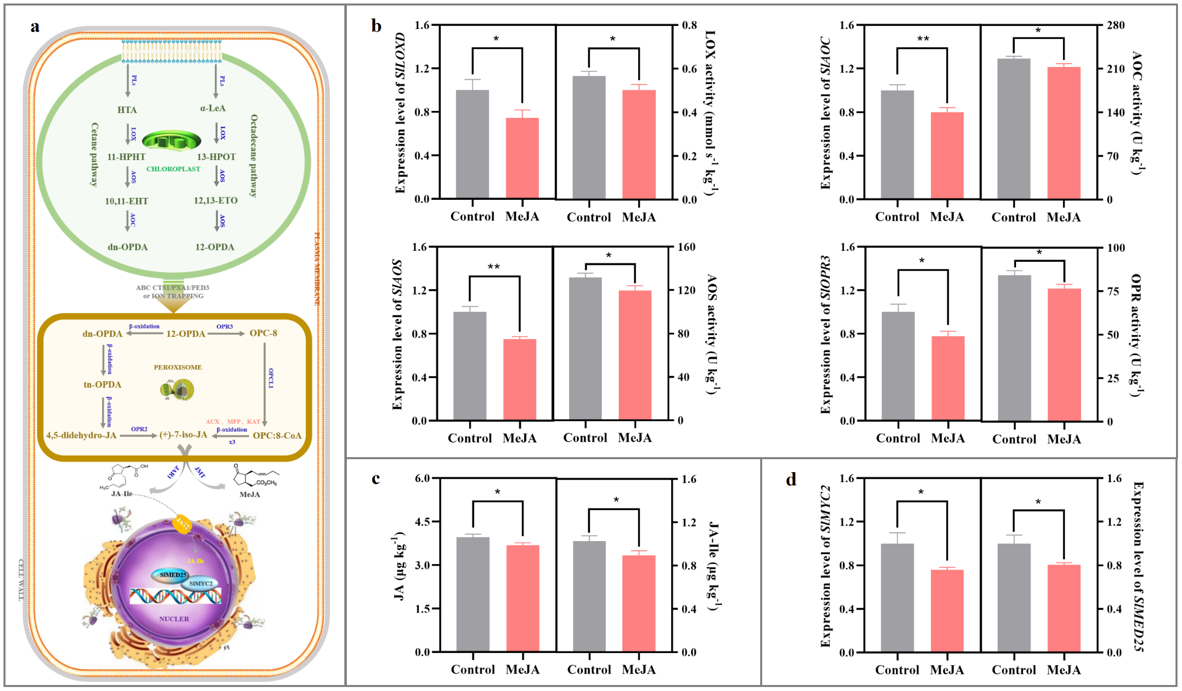 Figure 2. Impact of exogenous MeJA fumigation at breaker stage on JAs metabolism in the red ‘FL 47’ tomato. (a) JAs biosynthesis & signaling transduction pathways. In higher plant, JAs formation is derived from α-linolenic acid (α-LeA) and hexadecatrienoic acid (HTA) by the sequential catalytic actions of lipoxygenase D (LoxD), allene oxide synthase (AOS), and allene oxide cyclase (AOC), producing cis-(+)-12-oxophytodienoic acid (cis-(+)-OPDA) and dn-OPDA (Wu et al., 2011). After transportation into the peroxisome, cis-(+)-OPDA and dn-OPDA are catalyzed by several enzymes, such as 12-oxo-phytodienoic reductase 3 (OPR3), OPR2, OPC-8 coenzyme A ligase1 (OPCL1), etc., into (+)-7-iso-JA, which after epimerization into (-)-JA is further converted into various derivatives (Ali and Baek, 2020). JA-Ile has been characterized as the bioactive compound involved in JAs signaling transduction process (Fonseca et al., 2009). After transportation into the nucleus via jasmonic acid transfer protein 1 (JAT1), JA-Ile could bind to CORONATINE INSENSITIVE1 (COI1), an integral part of the Skp-Cullin-F-box (SCF) complex. Subsequently, COI1 targets JASMONATE-ZIM-DOMAIN proteins (JAZs) with the aid of inositol pentakisphosphate 5 (IP5) for poly-ubiquitination and subsequent degradation of JAZs by 26S proteome. Finally, MYC2 blockage was released to activate its downstream gene expression, such as LoxD and threonine deaminase (TD), etc (Pauwels and Goossens, 2011; Wasternack and Hause, 2013). Additionally, the initiation of transcription requires the interaction of MYC2 and MEDIATOR25 (MED25) subunit in the Mediator complex to recruit general transcription factors (GTFs) and RNA polymerase II (Ali and Baek, 2020; Gimenez-Ibanez et al., 2015). (b) Gene (SlLOXD, SlAOC, SlAOS, and SlOPR3) expression profiles and enzyme (LOX, AOC, AOS, and OPR) actives in JAs biosynthesis pathway. (c) Endogenous JA and JA-Ile contents. (d) Gene (SlMYC2 and SlMED25) expression profiles in JAs signaling transduction pathway. ‘FL 47’ tomato at breaker stage were treated with MeJA or H2O (control) for 24 h prior to ripening at 20 °C; fruits were sampled at the same time when the control and MeJA-treated fruits turned red. The expression level of each gene in the control fruit was set as 1.0 based on qRT-PCR result. Data represent means ± standard deviation (SD) from three biological replicates; and significant differences (*p < 0.05; **p < 0.01) were determined via one-way ANOVA followed by Tukey’s HSD post-hoc test. Abbreviations: ACX, acyl-CoA oxidase; AOC, allene oxide cyclase; AOS, allene oxide synthase; 4,5-didehydro-JA, 4,5-didehydro-jasmonic acid; dn-OPDA, dinor OPDA; 10,11-EHT, 10,11(S)-epoxy-hexadeca (tri) enoic acid; 12,13-EOT, 12,13-(S)- epoxy-octadecatrienoic acid; 11-HPHT, 11-hydro- peroxyhexadecatrie- noic acid; 13-HPOT, 13-hydroperoxyoctadecatrienoic acid; HTA, hexadecatrienoic acid; (+)-7-iso-JA, (+)-7-iso-jasmonic acid; JA-Ile, jasmonoyl-isoleucine; JAR1, jasomonate resistant 1; JMT, jasmonic acid carboxyl methyltransferase; KAT, 3-ketoacyl-CoA thiolase; α-LeA, α-linolenic acid; LOX, lipoxygenases; OPC-8, 3-oxo-2-((Z)-pent-2-en-1-yl) cyclopentane-1- octanoic acid; MeJA, methyl jasmonate; MFP, multifunctional protein; OPC, 8-CoA: 3-oxo-2-((Z)-pent-2-en-1-yl)cyclopentane-1-octanoyl-CoA; OPCL1, OPC-8 coenzyme a ligase1; 12-OPDA, 12-oxo-phytodienoic acid; OPR, OPDA reductase; PLs, phospholipases; tn-OPDA, tetranor-OPDA.