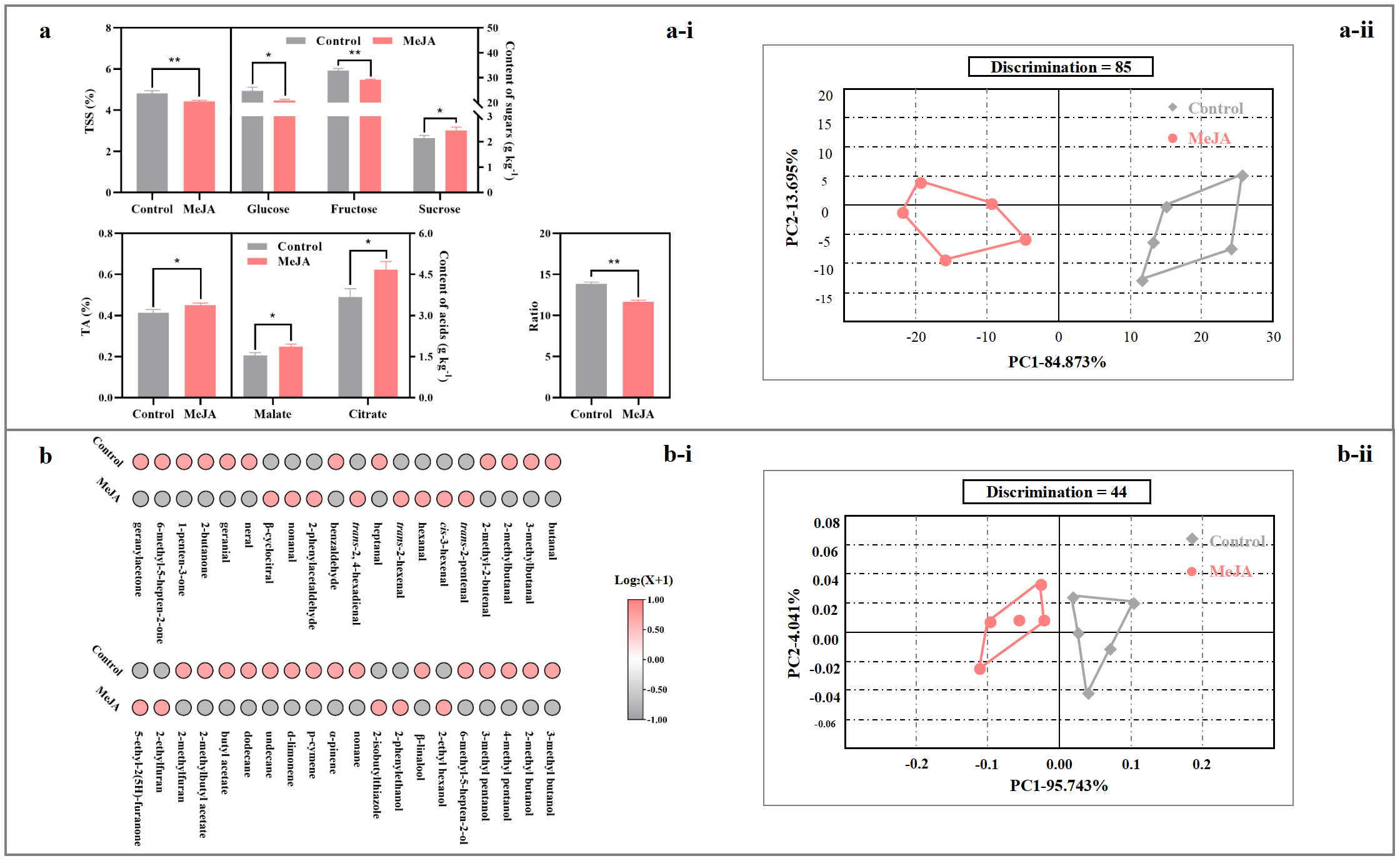 The electronic tongue (e-tongue) represents an alternative objective method for detecting variations in taste profiles (Raithore et al., 2015). The raw data obtained from the e-tongue analysis were multidimensional (7D) and thus subjected to PCA. As shown in Figure 4a-ii, the control fruit was clearly separated from MeJA-treated fruit along PC1, which explained 84.87% of total variance, with a Mahalanobis distance (MD) = 36.18, indicating a strong overall difference in liquid-phase taste matrix between treatments. A large Mahalanobis distance indicates strong matrix differences in liquids (e-tongue).