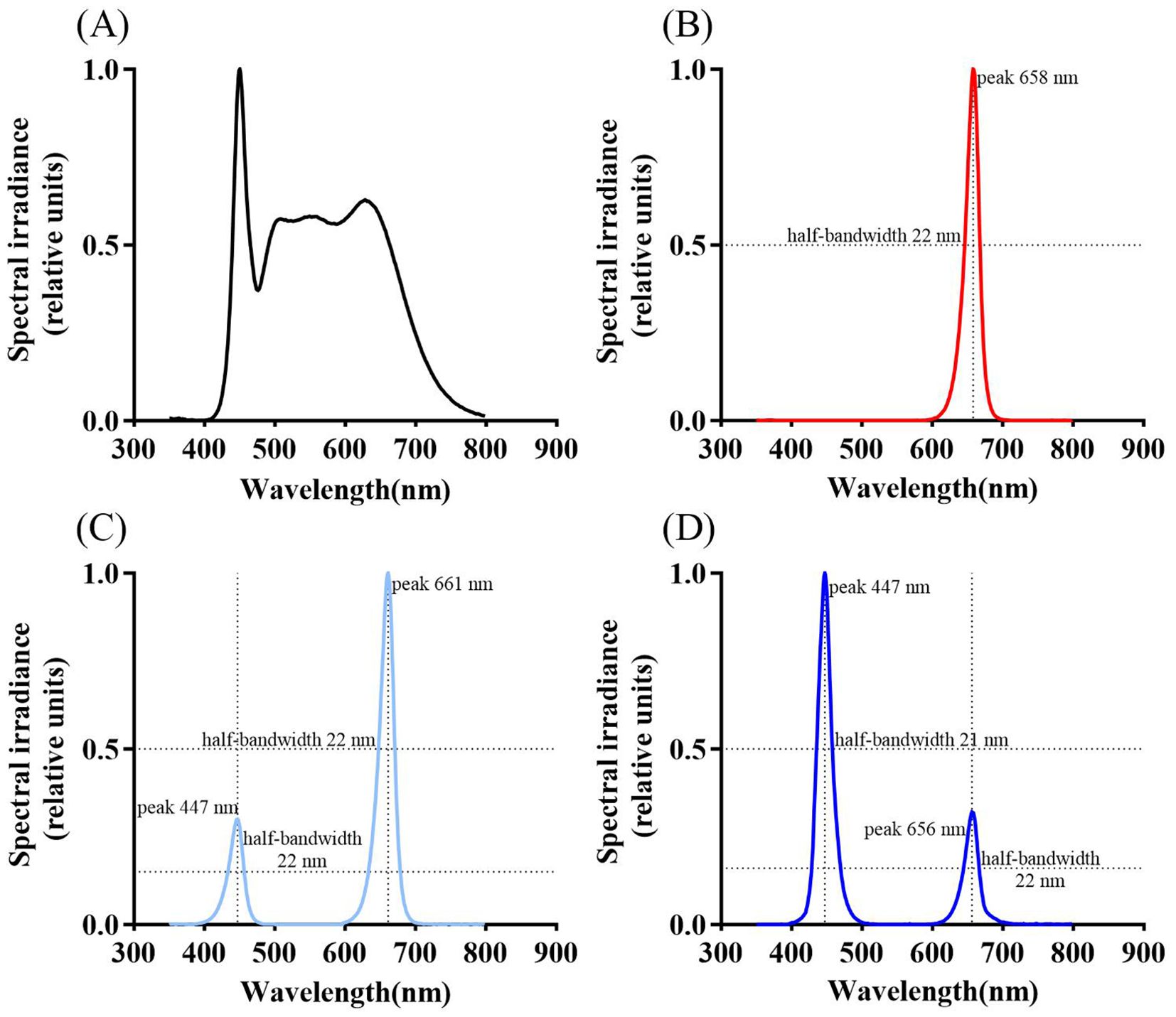 Figure 1. Spectral diagrams under different treatments: CK [W, (A)], red light treatment [R, (B)], the ratio of photosynthetic photon flux density (PPFD) between red light and blue light is 3:1 [R3B1, (C)], the ratio of photosynthetic photon flux density (PPFD) between red light and blue light is 3:1 [R1B3, (D)]. Peak wavelengths and half-bandwidths for each treatment spectrum are labeled in the figure.