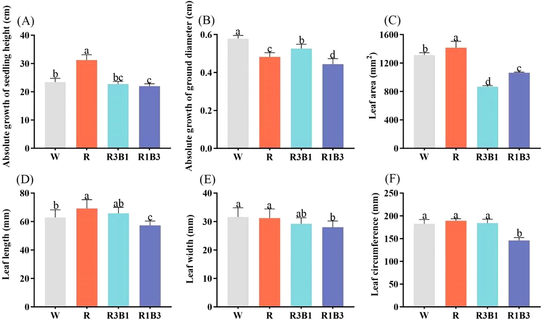 Figure 2. Effects of light quality on the growth of P. szechuanica var. tibetica heights (A), ground diameter (B), leaf area (C), leaf length (D), leaf width (E), and leaf circumference (F). Different lowercase letters indicate significant differences among treatments at P < 0.05. White: W, Red: R, R3B1 and R1B3: The ratio of photosynthetic photon flux density (PPFD) between red light and blue light is 3:1and 1:3.