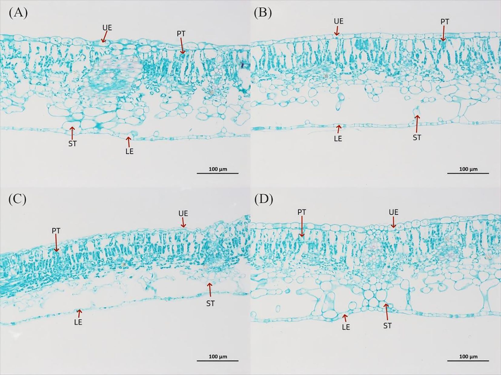 We further employed ImageJ software to determine parameters related to leaf tissue structure, including leaf thickness (LT), palisade mesophyll thickness (PT), spongy mesophyll thickness (ST), upper epidermal thickness (UE), and lower epidermal thickness (LE). For each sample, ten fields of view were analyzed, and the mean values obtained were used to calculate the leaf cell tense ratio (CTR), leaf spongy ratio (SR), and the PT/ST ratio using the following formulae:
