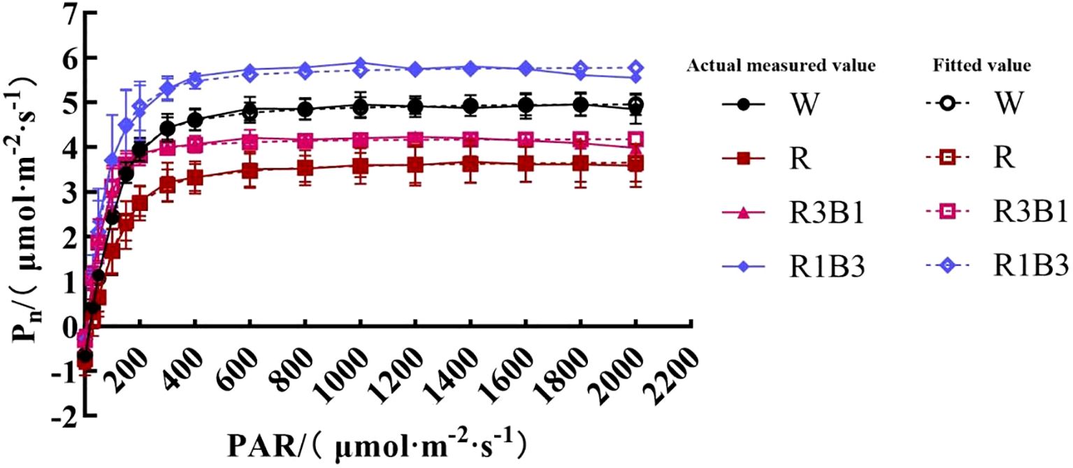 Figure 4. The response curves of Pn-PAR of P.szechuanica var. tibetica under different treatments. Of which the dashed lines represent fitted values, and the solid lines represent measured values. White: W, Red: R, R3B1 and R1B3: The ratio of photosynthetic photon flux density (PPFD) between red light and blue light is 3:1and 1:3.