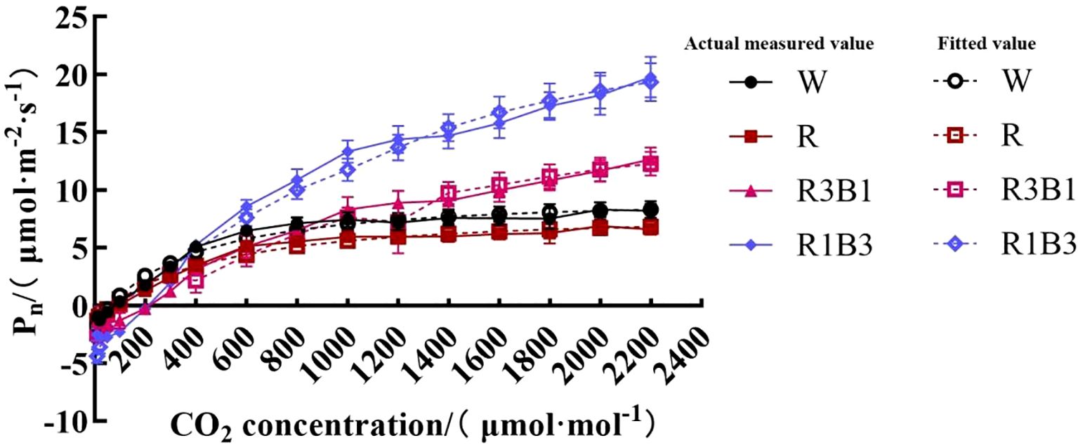 We calculated the CSP, CCP, maximum photosynthetic capacity (CPmax) and photorespiration rate (Rp) as per the CO2 response curve fitting formula (Table 5). The R2 values of all values models were higher than 0.9, which indicated that all models were highly efficient. The R1B3 showed higher average CPmax, CSP and CCP values than the R, R3B1 and W treatments.