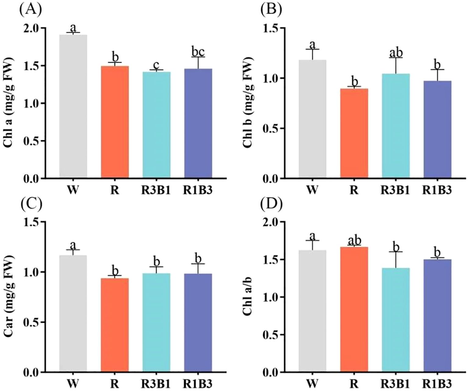 Figure 6. Effect of different light quality treatments on pigment contents. (A) Chl a, (B) Chl b, (C) Car, and (D) Chl a/b. Different lowercase letters indicate significant differences between different treatments (P < 0.05). White: W, Red: R, R3B1 and R1B3: The ratio of photosynthetic photon flux density (PPFD) between red light and blue light is 3:1and 1:3.