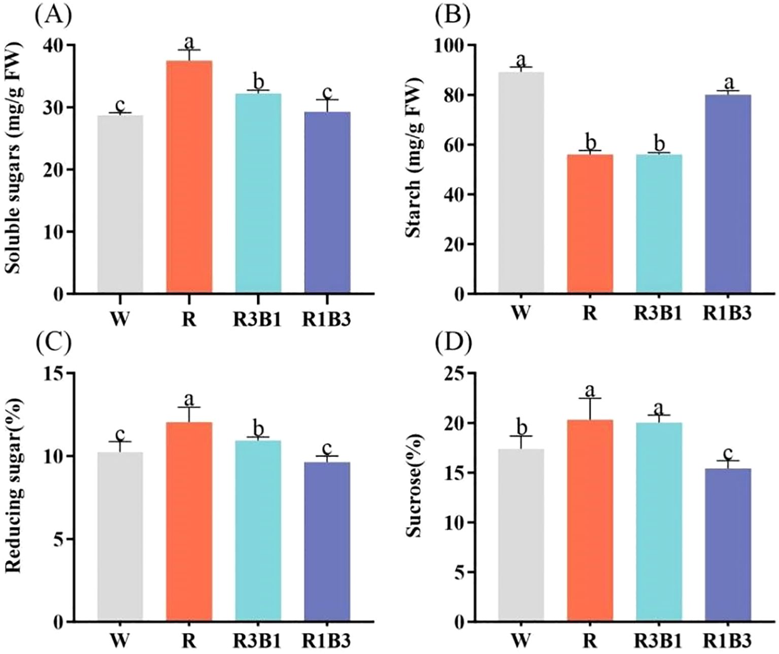 Figure 7. Effect of different treatments on soluble sugars (A), starch (B), reducing sugar (C) and sucrose (D) content. Different lowercase letters indicate significant differences between different treatments (P < 0.05). White: W, Red: R, R3B1 and R1B3: The ratio of photosynthetic photon flux density (PPFD) between red light and blue light is 3:1and 1:3.
