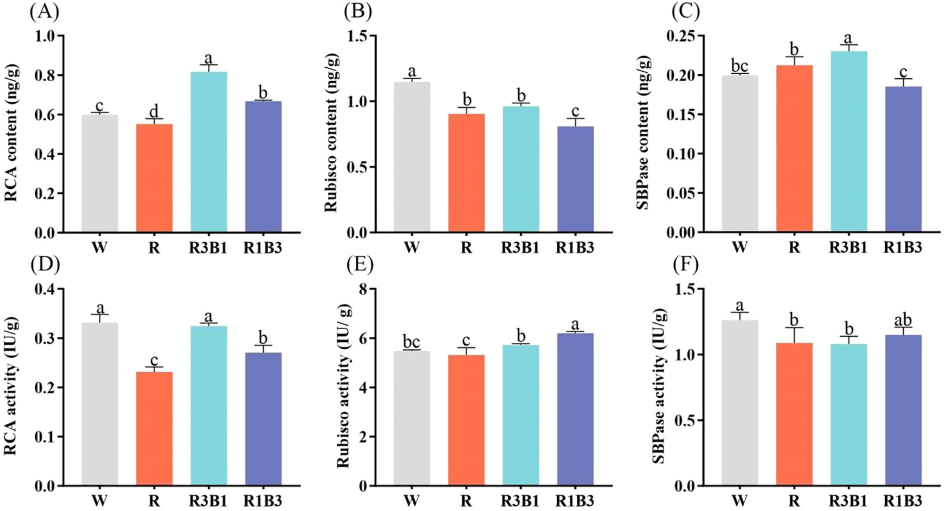 In this experiment, both the determination of photosynthetic enzyme (Rubisco activating enzyme (RCA), ribulose-1,5-bisphosphate carboxylase (Rubisco), and sedoheptulose-1,7-bisphosphatase (SBPase)) content and activity were performed using the enzyme-linked immunodeficient assay (ELISA) method, employing the ELISA kit provided by Beijing Chenglin Biotechnology Co., Ltd.