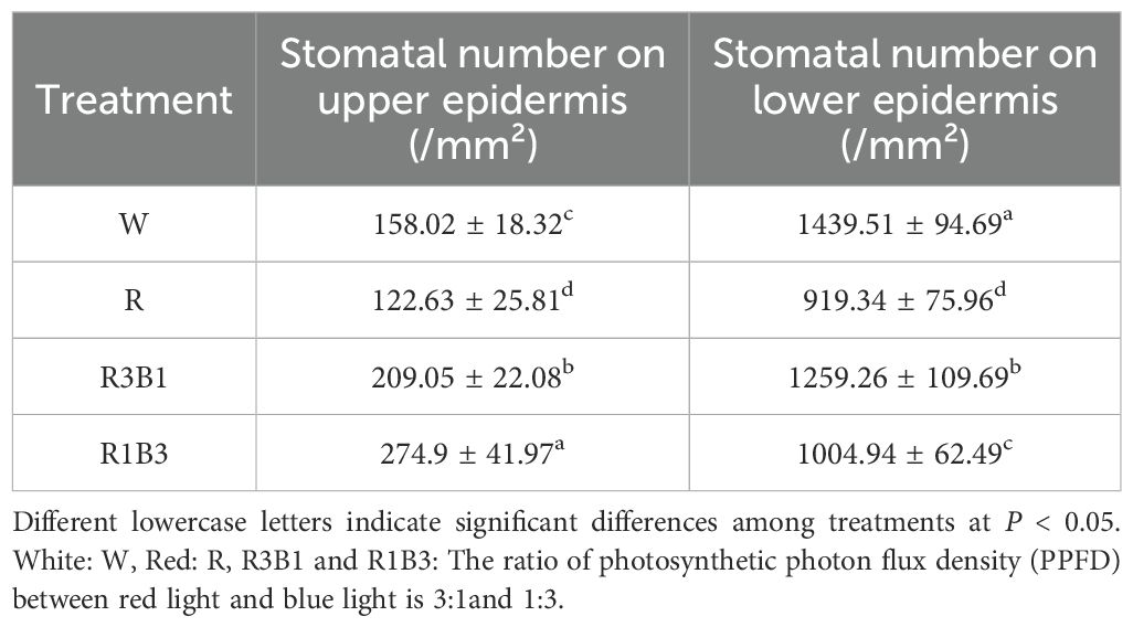 The internal structure of P. szechuanica var. tibetica seedling leaves changed under different light quality treatments (Figure 3 and Tables 1, 2). The results indicated that red light inhibited the number of stomata in both the upper (reduce 29%) and lower (reduce 36%) epidermises of P. szechuanica var. tibetica seedlings. In contrast, the R3B1 and R1B3 treatments increased stomatal counts in the upper epidermis while suppressing those in the lower epidermis (Table 1).