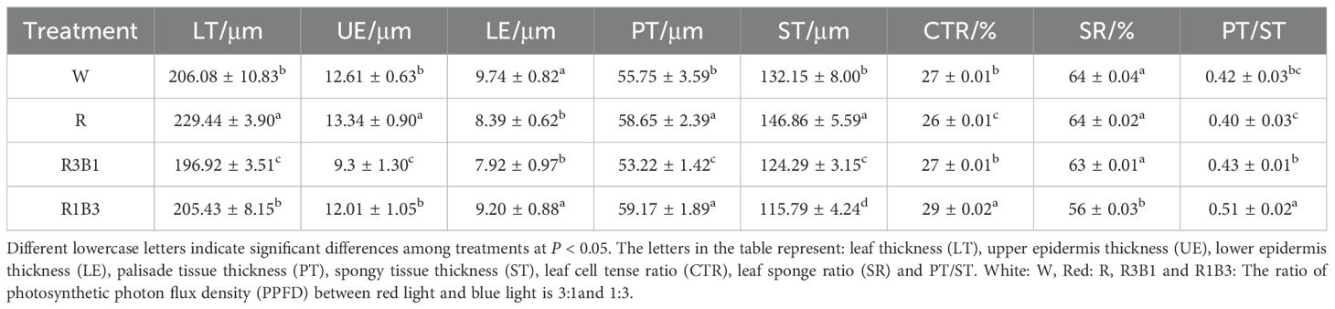 Under R treatment, the leaf thickness (LT, increase 10%), upper epidermis (UE, increase 5%), palisade tissue (PT, increase 5%), and spongy tissue (ST, increase 10%) were significantly increased, while the lower epidermis (LE, reduce 14%) and cell tension ratio (CTR, reduce 4%) were significantly decreased, when compared to W treatment (Figures 3A, B, Table 2). However, the LT, UE, LE, PT, and ST were significantly decreased under R3B1 treatment (Figures 4A, C, Table 2). Under R1B3 treatment, PT (increase 6%) and the ratio of PT/ST (increase 18%) showed significant increases, whereas the spongy tissue ratio (SR) was markedly reduced (Figure 3D).