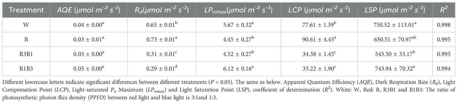 Table 4. Comparison of Pn-PAR response parameters of P. szechuanica var. tibetica under different light quality.