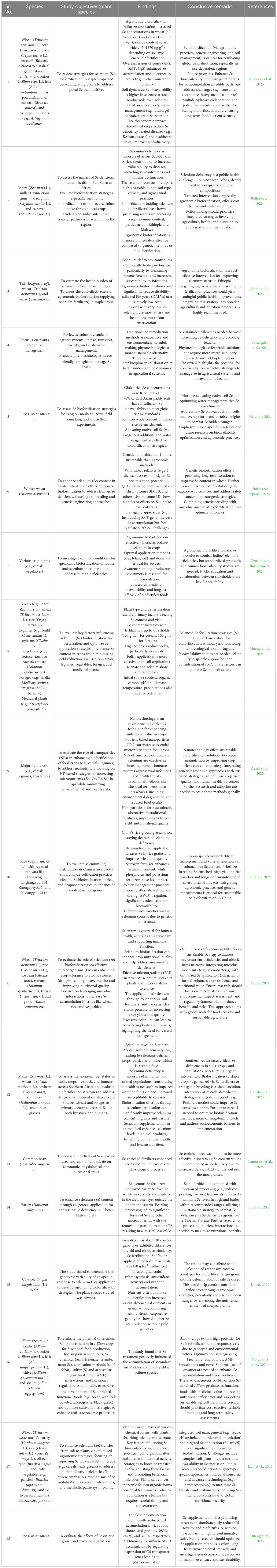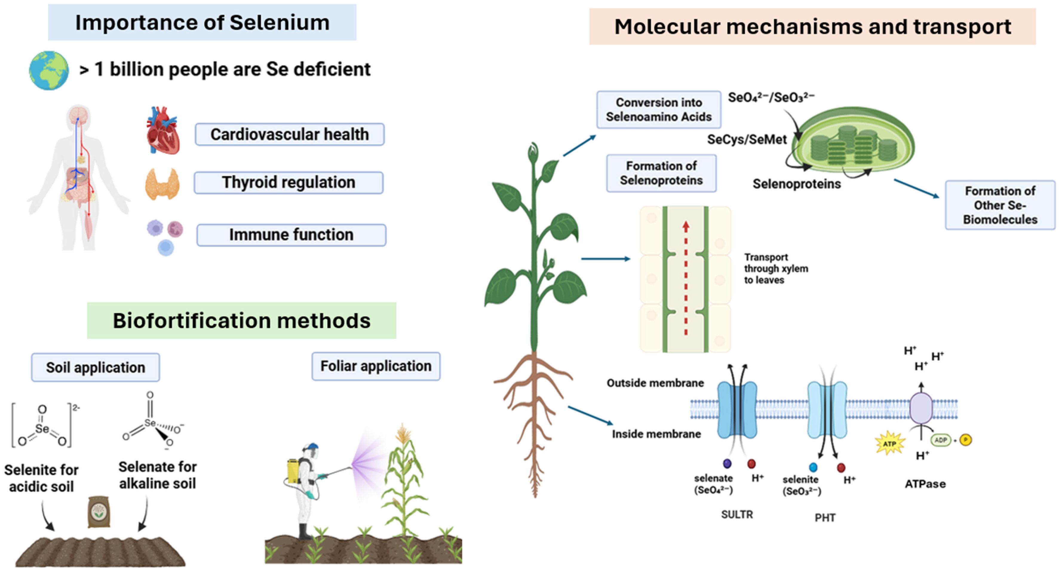 Selenium (Se) is a member of the chalcogen family and is required for key cellular physiological functions in humans (Banuelos et al., 2023). Trace quantities of Se in the diet are critical for disease prevention because they support the immune system (Lan et al., 2024). In contrast, its deficiency is linked to Keshan disease, a cardiovascular disease primarily affecting children and females, and bone disease, which is a chronic, degenerative osteoarticular disorder (affects bones and joints (Rayman, 2012). Other health conditions include thyroid disorders, autoimmune and neurodegenerative diseases, and cancer, which can lead to death (Ekumah et al., 2021; Duță et al., 2025). It is estimated that approximately 0.5–1 billion individuals exhibit inadequate Se uptake, which is a serious health concern (Jones et al., 2017; Dinh et al., 2019). Alternatively, adequate Se uptake boosts immunity in both animals and humans. In China, agricultural lands are deficient in Se, and approximately 60% of the Chinese population suffers from inadequate dietary Se intake, which is a serious health concern (Liu et al., 2021a).