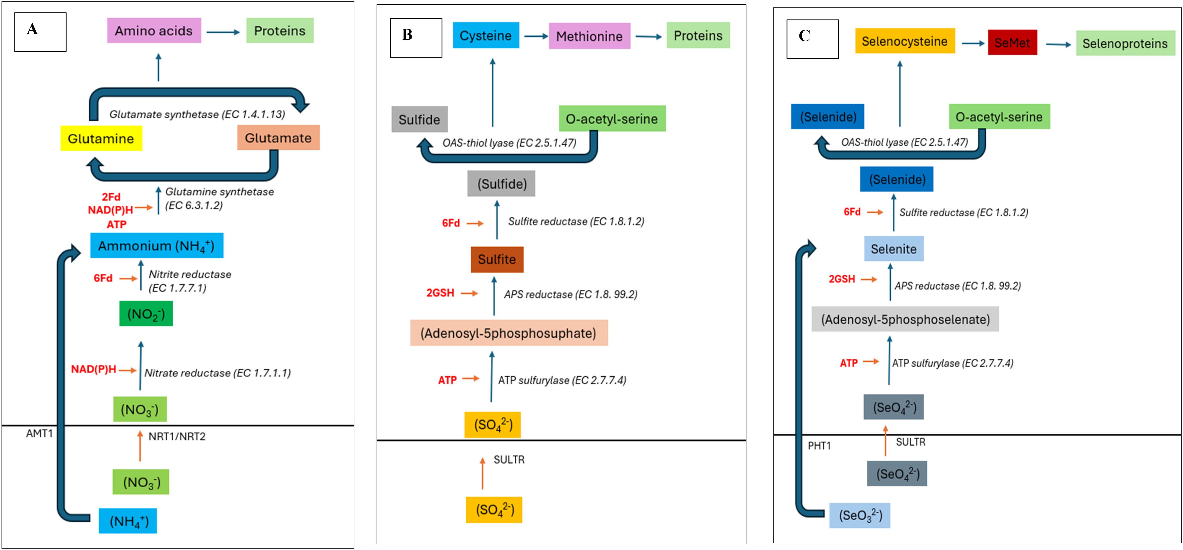 Figure 2. Schematic diagram showing ubiquitous nature of pathways involved in the assimilation of N, S, Se required for amino acid synthesis. (A) Nitrogen assimilation in roots follows sequential reduction into nitrite and ammonium which is then incorporated into amino acids. (B) Sulphur assimilation also follows same sequential reduction into sulfite and sulfide before synthesis of S-containing amino acids primarily cysteine and methionine. Lastly, (C) Selenium assimilation follows the sequential reduction into selenite, selenide and finally used to synthesize selenocysteine and selenomethionine which in-turn is incorporated into selenoproteins.
