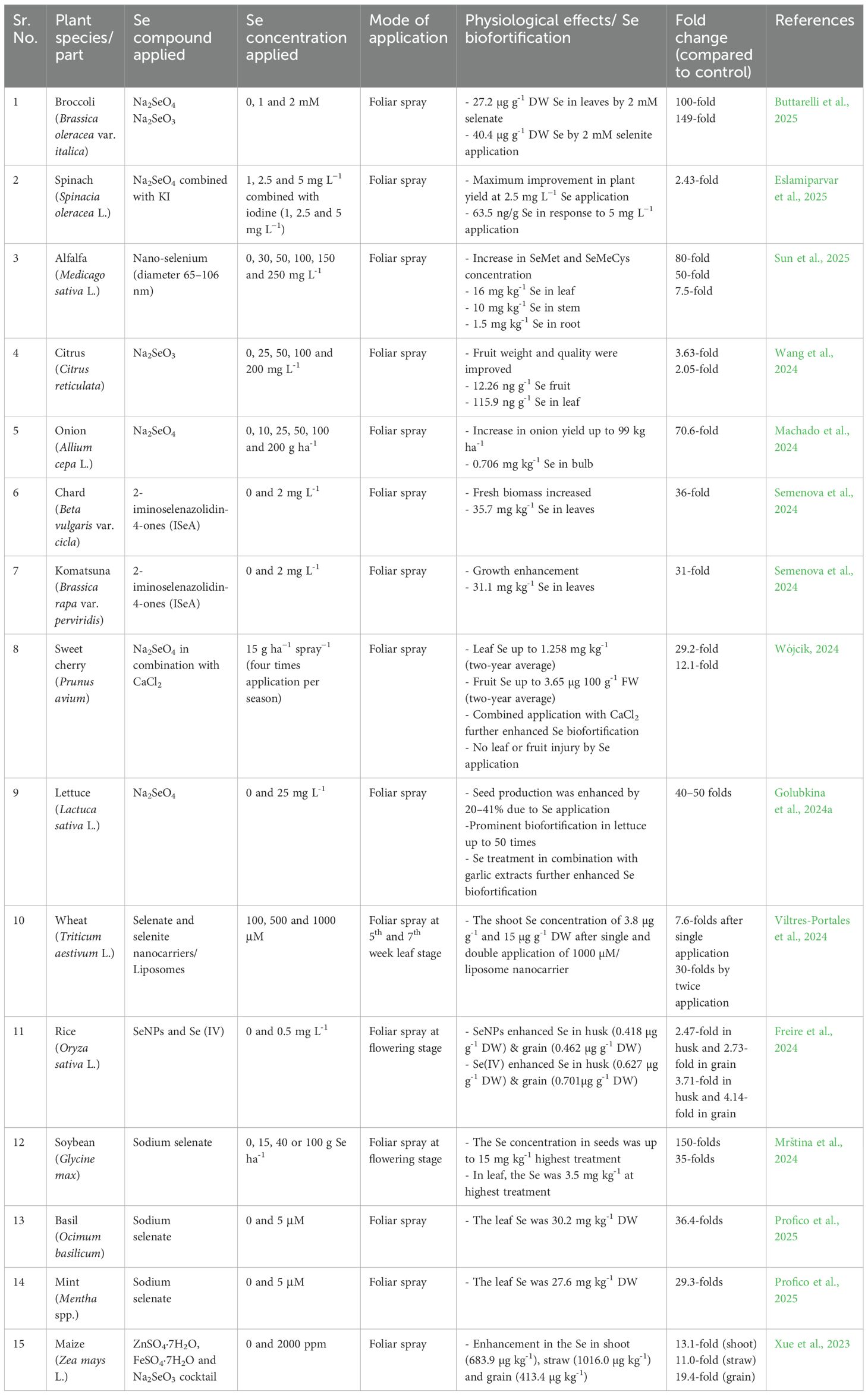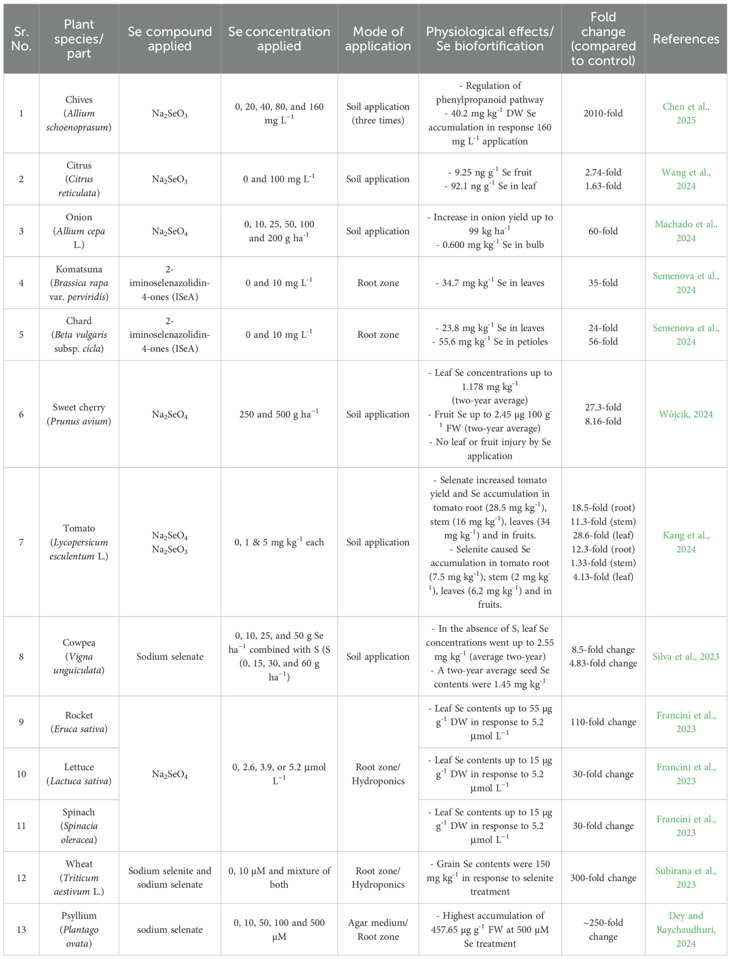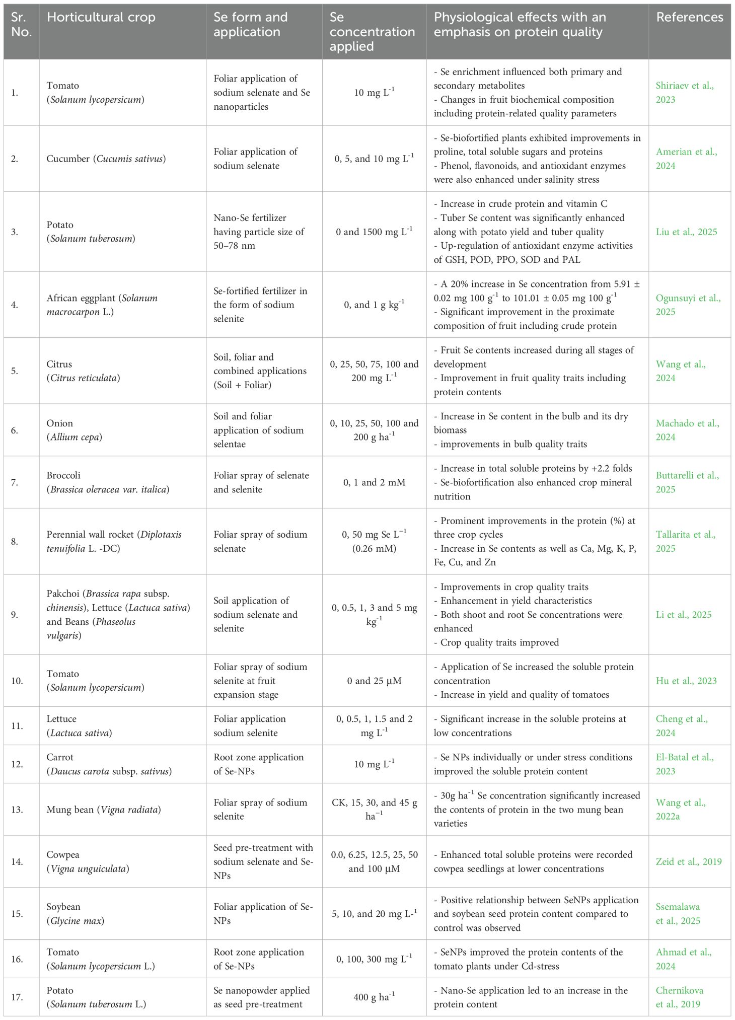 Selenium is beneficial to plants in trace quantities, and Se biofortification of crops has gained particular attention in recent years. Horticultural crops can serve as a source of Se to counter Se malnutrition in humans; however, this is a complex approach that depends on multiple factors. Various researchers have reported the beneficial effects of Se application on plants, and considerable success has been achieved in terms of Se biofortification in crops. In cereals, the Se content can be enhanced by foliar application of seleniferous compounds (Radawiec et al., 2021). For instance, seleno-cyanoacetate application causes the accumulation of selenomethylcysteine (SeMeCys) in brown rice (Yuan et al., 2023). In addition, the combined application of SeMet and P enhanced selenocysteine (SeCys) levels in winter wheat (Hu et al., 2023). It has also been reported that SeCys are more effective and enhance Se translocation in grains and further assimilation into organic compounds (Liu et al., 2023a). Exogenous Se also improves the crop quality characteristics of wheat and maize (Broadley et al., 2010; Zahedi et al., 2019). In fruits, Se foliar spraying improved the Se content in apples and oranges (Wojcik, 2023; Wang et al., 2024). Improvements in the quality characteristics of strawberries and their Se content by exogenous Se have also been reported (Zahedi et al., 2019). In addition, biofortification of vegetables, legumes, forages, and medicinal plants has been performed (reviewed by Huang et al., 2024b). The foliar application of sodium selenate and Se nanoparticles (10 mg L-1) improved the biochemical composition of tomato fruits, including protein-related quality parameters (Shiriaev et al., 2023). Similarly, potato treated with nano-Se fertilizer exhibited upregulation of the enzyme activities of GSH, POD, PPO, SOD, and PAL and increased vitamin C and protein content in tubers (Liu et al., 2025). Similarly, soil and foliar application of exogenous Se improved citrus quality (Wang et al., 2024). Four-time application of Na2SeO4 at 15 g ha−1 spray−1 improved Se content in fruits up to 12 folds (Wójcik, 2024). A summary of different studies related to the biofortification of different horticultural crops is presented (Table 1).