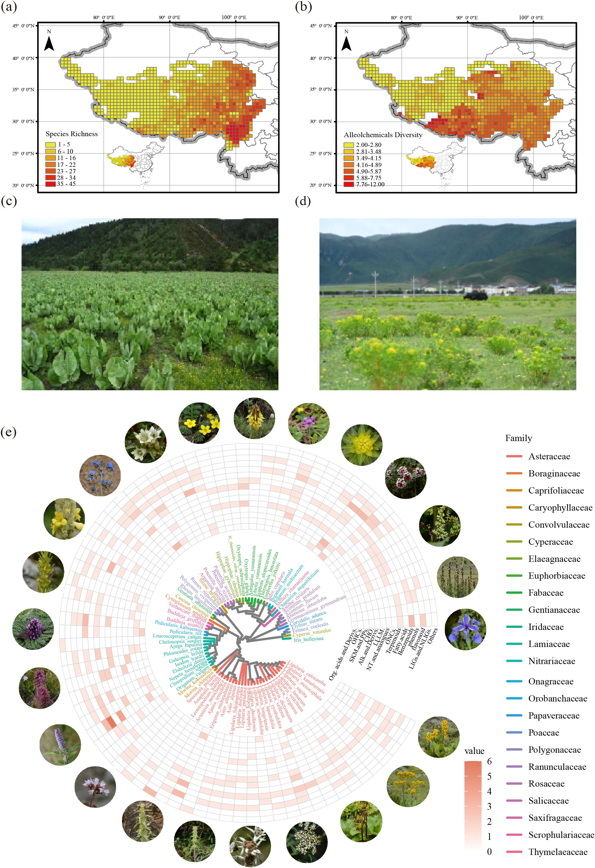 Figure 1. Spatial and phylogenetic patterns of native invasive plant richness and allelochemical diversity across the QTP. (a) Spatial distribution of native invasive plant richness. (b) Distribution pattern of allelochemical diversity. Community landscapes invaded by Ligularia cymbulifera (c) and Euphorbia jolkinii (d) are shown as representative examples of habitat alternation due to native invasive species. (e) A phylogenetic tree and corresponding heatmap show the number and types of allelochemicals across invasive species. Org.acids.and.Derivs stands for Organic acids and derivatives, OHCs stands for Organoheterocyclic compounds, SKM.and.PPs stands for Shikimates and Phenylpropanoids, CHO stands for Carbohydrates, Alk.and.Derivs stands for Alkaloids and derivatives, LLLM. stands for Lipids and lipid-like molecules, NT.and.analogues stands for Nucleosides nucleotides and analogues, ONCs stands for Organic nitrogen compounds, LIGs.and.NLIGs stands for Lignans neolignans.