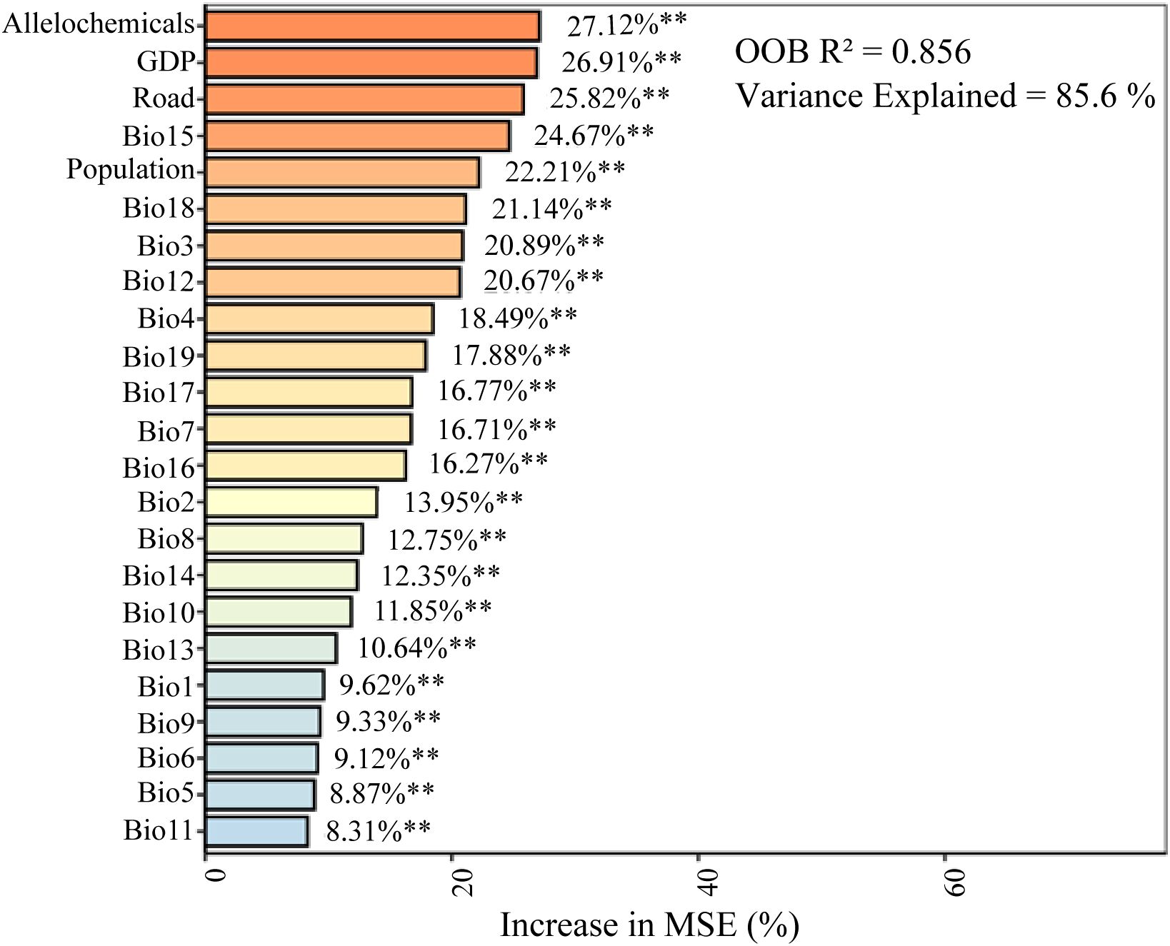 Figure 2. The relative importance of multiple drivers influencing the distribution of native invasive plants on the QTP, as determined by random forest modeling. Significance levels: **P < 0.01. Bio1: annual mean temperature, Bio2: mean diurnal range, Bio3: isothermality, Bio4: temperature seasonality, Bio5: max temperature of warmest month, Bio6: min temperature of coldest month, Bio7: temperature annual range, Bio8: mean temperature of wettest quarter, Bio9: mean temperature of driest quarter, Bio10: mean temperature of warmest quarter, Bio11: mean temperature of coldest quarter, Bio12: annual precipitation, Bio13: precipitation of wettest month, Bio14: precipitation of driest month, Bio15: precipitation seasonality, Bio16: precipitation of wettest quarter, Bio17: precipitation of driest quarter, Bio18: precipitation of warmest quarter, and Bio19: precipitation of coldest quarter.