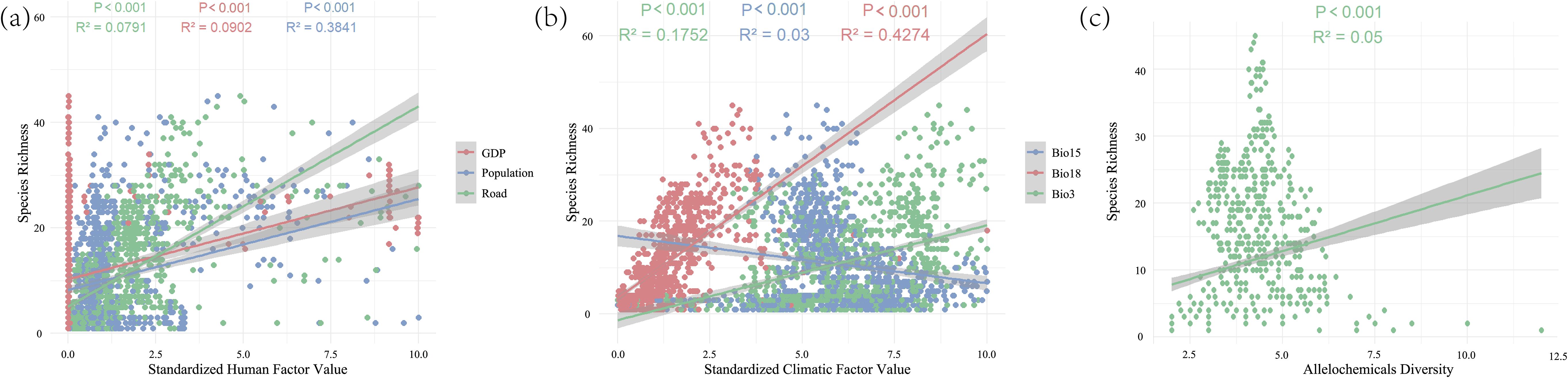 Figure 3. Ordinary least square regression results showing the effects of climatic, human, and allelochemical drivers on SR. (a) The human factor in SR regression; (b) The climatic factor in SR regression; (c) The allelochemicals in SR regression. R² represents the goodness of fit of a regression model to observed data, with values closer to 1 indicate a stronger model fit. Significance levels: *P < 0.05; **P < 0.01; ***P < 0.001. Human and climatic variables were standardized prior to analysis. Bio3: isothermality, Bio15: precipitation seasonality, and Bio18: precipitation of warmest quarter.