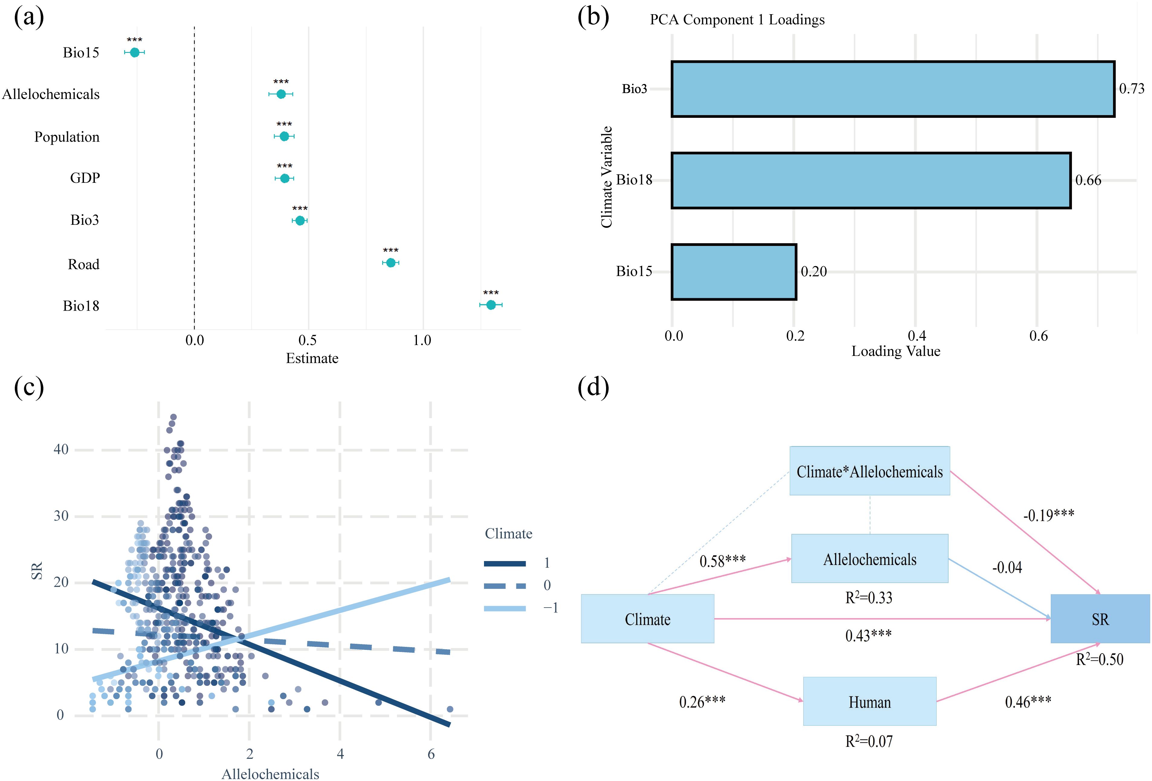 Figure 4. Results of mixed-effects model, interactions, and structural equation model (SEM). (a) Standardized effect sizes of different drivers on species richness. (b) Loading of climatic variables (Bio3, Bio15, and Bio18) on the first PCA axis. (c) Interaction between climate (the first PCA axis of bio3, bio15, and bio18) and allelochemical diversity on SR. (d) SEM of three key drivers on species richness. Significance levels: ***P < 0.001. Bio3: isothermality, Bio15: precipitation seasonality, Bio18: precipitation of warmest quarter.