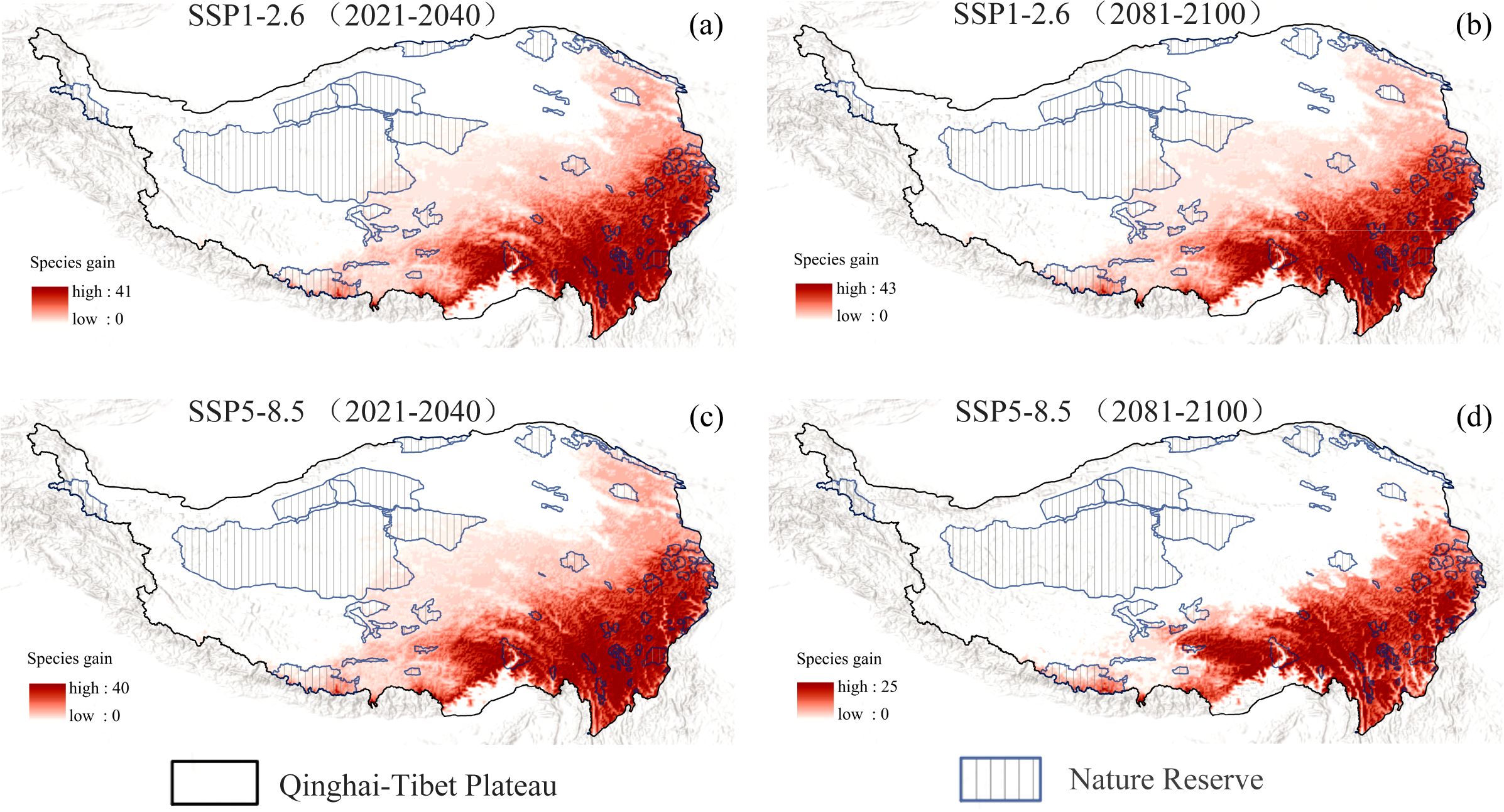 Under the SSP1-2.6 scenario, projections for both the near future (2021-2040) and the late century (2081-2100) indicate that the eastern, southeastern, and southern regions of the QTP will remain primary hotspots for native invasive plant expansion, with newly suitable habitat covering approximately 199.26 × 10⁴ km² (78.56% of the QTP) and 197.04 × 10⁴ km² (77.68%) (Supplementary Table S5), respectively. Notably, a significant portion of this expansion overlaps with protected areas (PAs), reaching 46.31 × 10⁴ km² (74.88% of total PA) in the near future and 44.56 × 10⁴ km² (72.04%) (Supplementary Table S5) by the end of the century, illustrating a consistent northwestward encroachment into PAs (Figures 5a, b). Under the high-emissions (SSP5-8.5) scenario, the expansion trend during 2021–2040 remained comparable, with 197.62 × 10⁴ km² (77.91%) of newly suitable habitat, including 46.00 × 10⁴ km² (74.38%) (Supplementary Table S5) overlapping with PAs. However, by 2081-2100, the total expansion area decreased substantially to 121.29 × 10⁴ km² (47.82%), and overlap with PAs dropped markedly to 14.58 × 10⁴ km² (23.57%) (Supplementary Table S5), although existing hotspots in the eastern, southeastern, and southern hotspots persisted (Figures 5c, d). These results quantitatively highlight that under sustained low-emission scenarios, invasive hotspots are not only likely to intensify but also increasingly encroach into northwestern protected zones, whereas high-emission scenarios may restrict overall expansion but still sustain significant pressure in strategic regions.