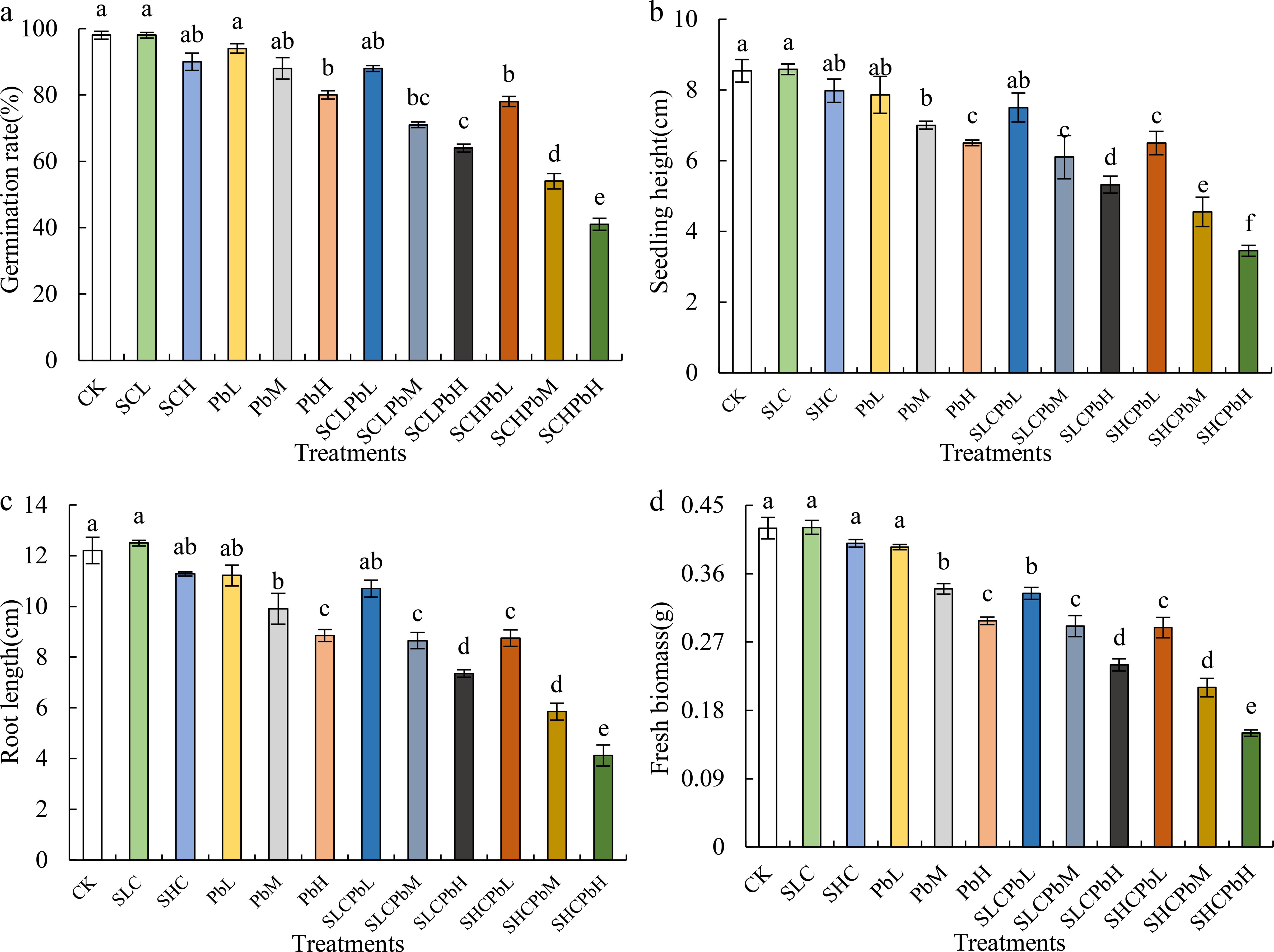 Figure 1. Seed germination and seedling growth parameters of wheat in different treatment groups. Bars (mean ± SE) with different lowercase letters indicate a significant difference (P < 0.05). (a) germination rate, (b) seedling height, (c) root length, and (d) fresh biomass. CK, control; SCL, A. tauschii stem-leaf extract (low concentration); SCH, A. tauschii stem-leaf extract (high concentration); PbL, low Pb concentration; PbM, medium Pb concentration; PbH, high Pb concentration; SCLPbL, SCL and PbL; SCLPbM, SCL and PbM; SCLPbH, SCL and PbH; SCHPbL, SCH and PbL; SCHPbM, SCH and PbM; SCHPbH, SCH and PbH.