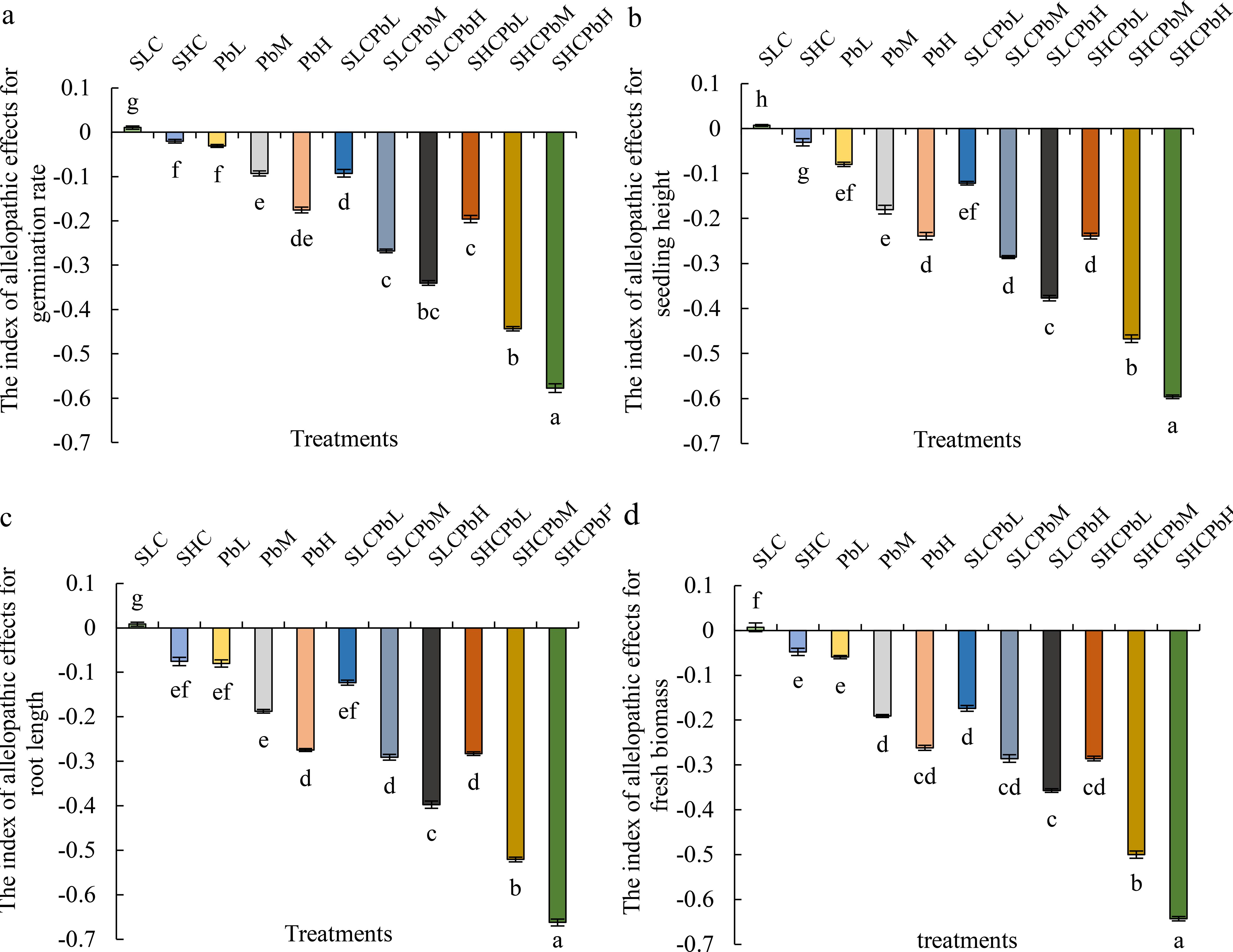 Figure 2. Indices of allelopathic effects on wheat germination parameters in different treatment groups (see Figure 1 for abbreviations). Bars (mean ± SE) with different lowercase letters indicate a significant difference (P < 0.05). The index indicates a positive impact when the value is positive, and a negative impact when the value is negative. Index of allelopathic effects on (a) germination rate, (b) seeding height, (c) root length, (d) fresh biomass.