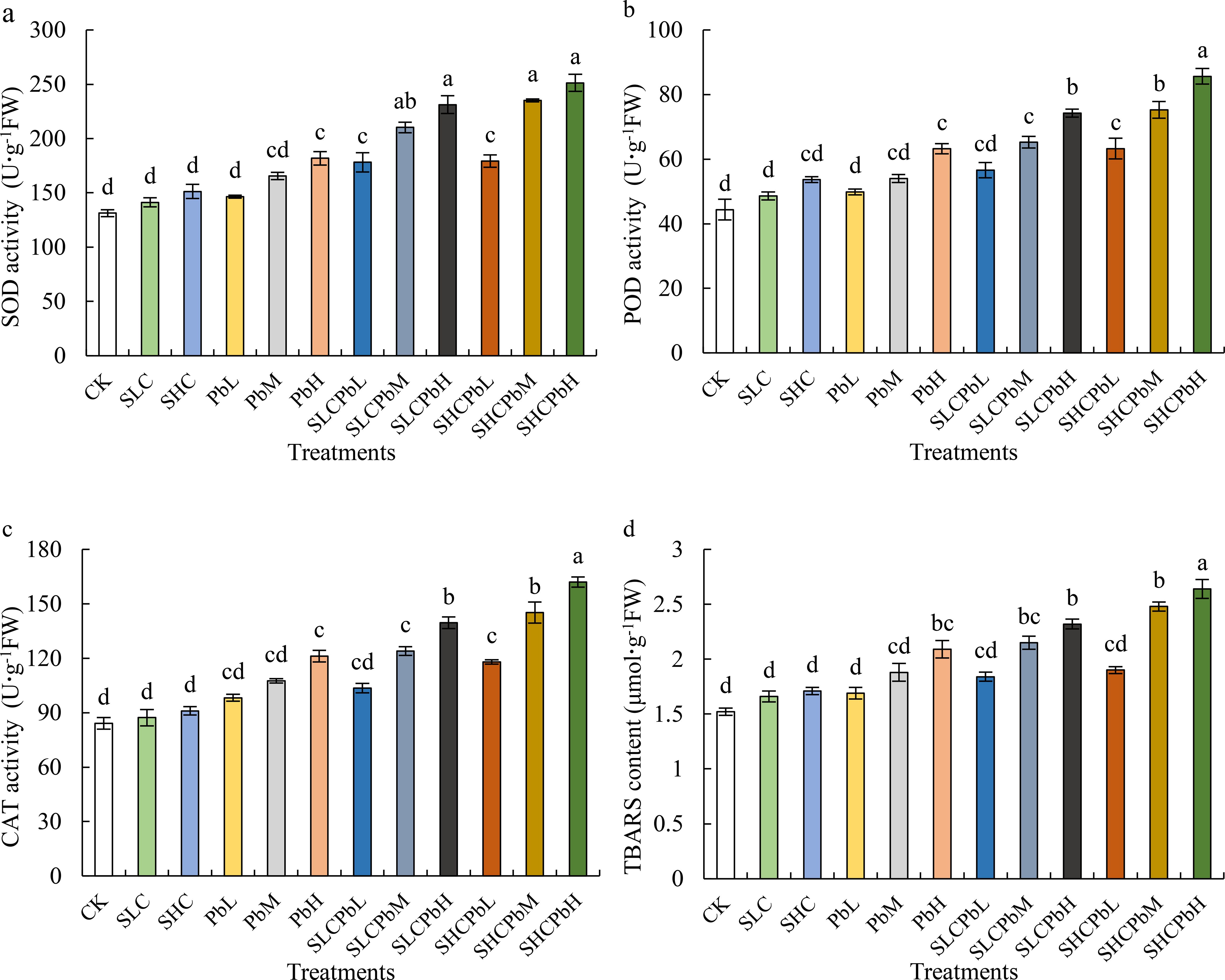TBARS content in wheat seeds was not significantly affected by individual treatments with SCL, SCH, PbL, or PbM. However, the PbH treatment and all the combined treatments (SCLPbL, SCLPbM, SCLPbH, SCHPbL, SCHPbM and SCHPbH) significantly increased TBARS levels. Specifically, the PbH, SCLPbM, SCLPbH, SCHPbM, and SCHPbH treatments showed significant increases compared to the control group (P < 0.05). Of all the treatments, SCHPbH had the most pronounced effect, increasing SOD, POD, and CAT activities, as well as TBARS content, by 40.14%, 35.42%, 37.28% and 38.95% respectively, compared to the control (P < 0.05).