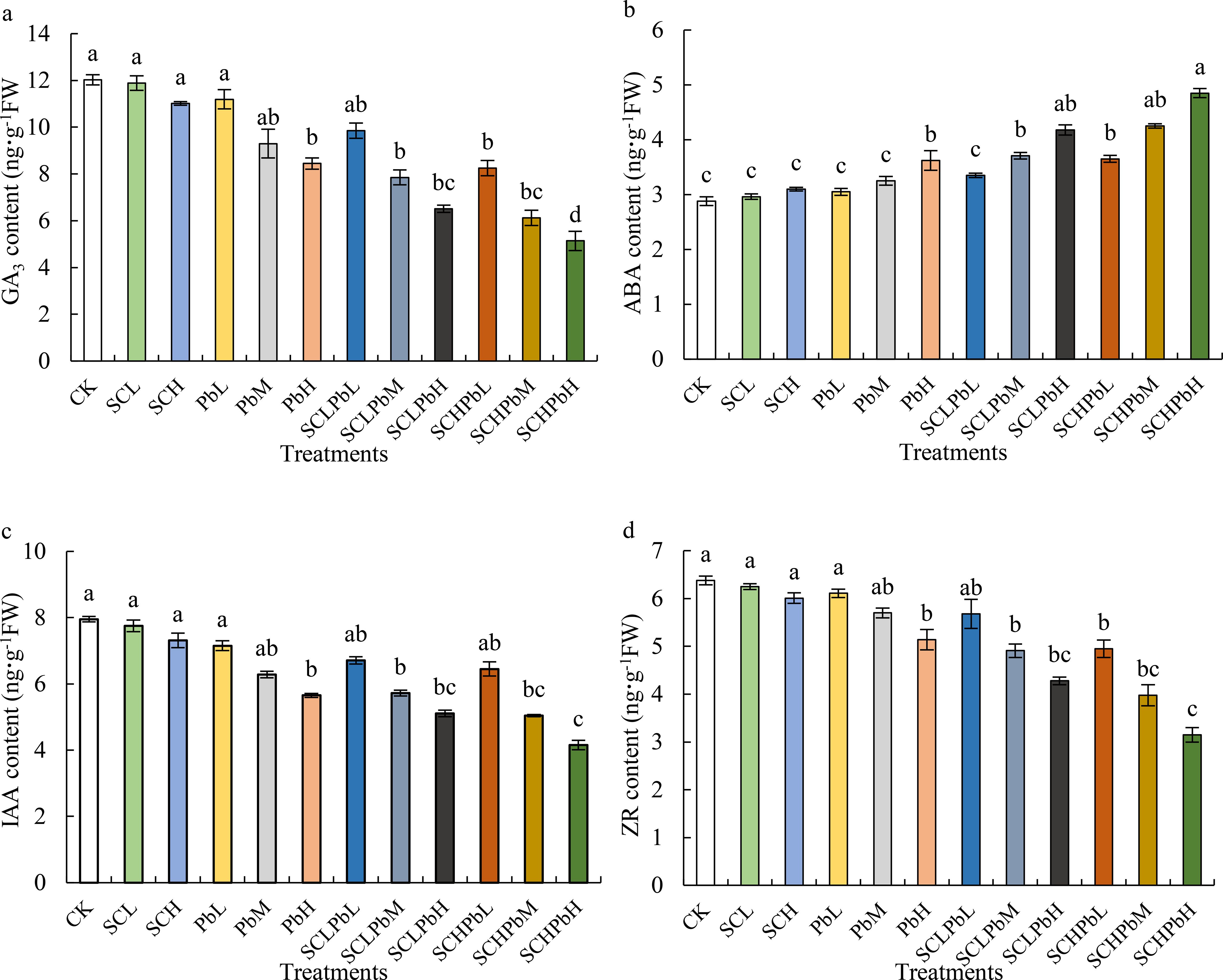 Compared to the CK, individual treatments with A. tauschii extract (SCL and SCH) or low-to-moderate Pb concentrations (PbL and PbM) did not significantly alter phytohormone levels in wheat seeds (Figure 4). However, a high Pb concentration (PbH) and all combined treatments (extract + Pb) significantly decreased GA3, IAA, and ZR content while increasing ABA content (P < 0.05). Specifically, GA3 and ZR contents were significantly reduced in the PbH, SCLPbM, SCLPbH, SCHPbL, SCHPbM, and SCHPbH treatments compared to the CK (P < 0.05). Similarly, these treatments significantly altered ABA and IAA content relative to the control (P < 0.05). The SCHPbH had the most pronounced effects, with GA3, IAA, and ZR contents decreased by 37.70%, 35.66%, and 36.36%, respectively, while ABA content increased by 40.58% compared to the CK (P < 0.05).