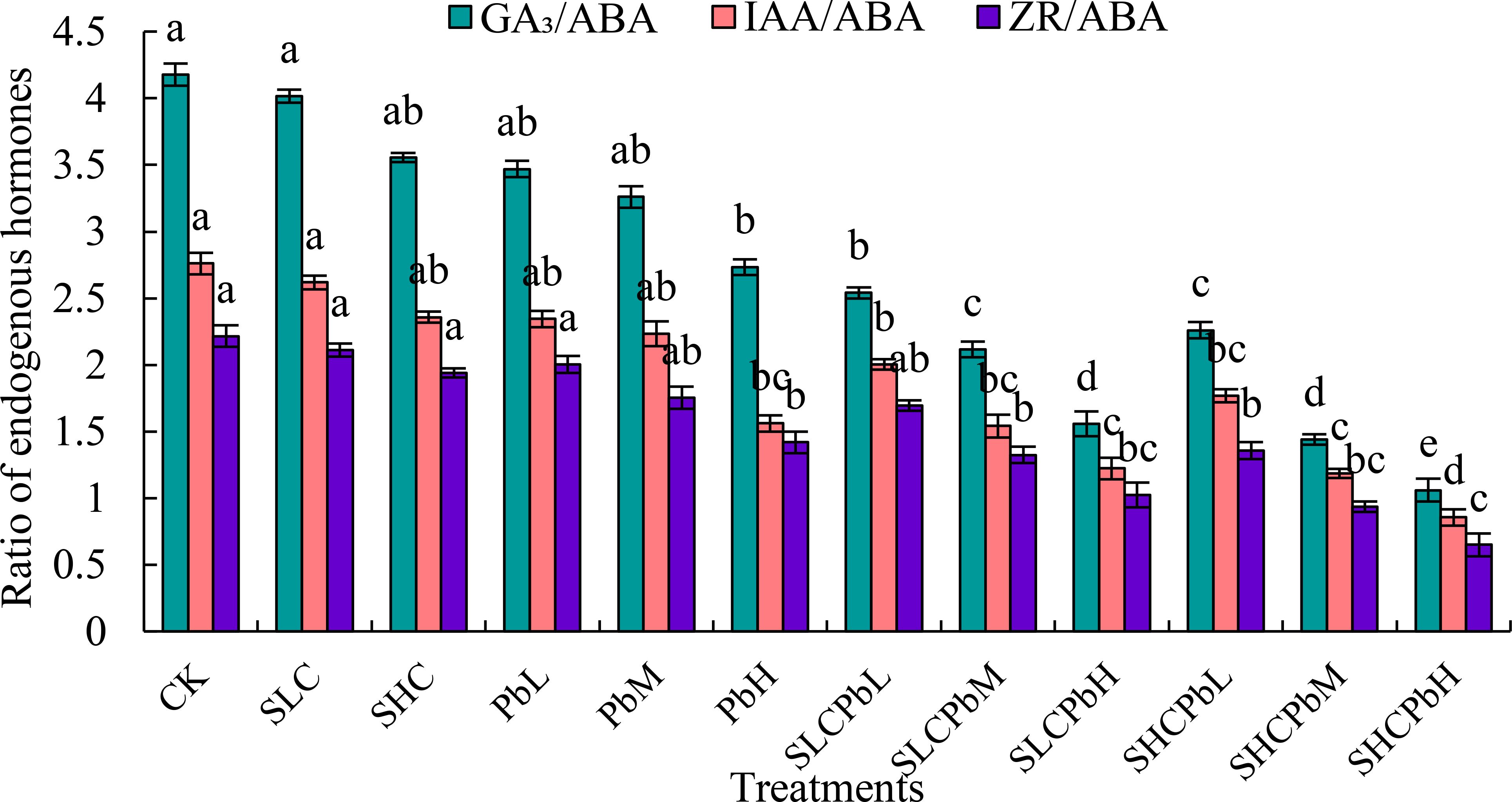 Figure 5. Ration of endogenous hormones in wheat seeds in different treatment groups (see Figure 1 for abbreviations). Bars (mean ± SE) with different lowercase letters indicate a significant difference (P < 0.05).
