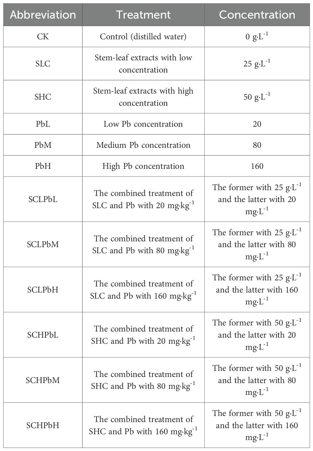 The plant material was collected in December 2024 from an experimental field in Dianzhuang Town, Luolong District, Luoyang City, Henan Province, China (34°41’ N, 112°37’ E). Well-developed A. tauschii plants at the tillering stage were randomly selected before winter, and their above-ground tissues (stems and leaves) were harvested for subsequent analysis. The study region has a typical temperate monsoon climate. The mean annual temperature is 14.9°C, with an average annual precipitation of 578.2 mm. The area receives substantial solar radiation, enjoying 2,164 hours of sunshine per year, and benefits from an extended growing season of 219 frost-free days. The aerial parts of A. tauschii were sequentially rinsed with tap water and deionized water to remove surface contaminants. After air-drying, the plant material was cut into small pieces, and 50.0 g (± 0.0001 g) was accurately weighed and transferred to a 1-L beaker containing 500 mL of distilled water. The mixture was incubated at 25 °C for 48 h with occasional stirring. The aqueous extract was subsequently filtered through double-layer filter paper to remove plant debris, yielding a stock solution with a concentration of 100 g/L. The extract was stored at 4 °C until further use. Before use, the stock solution of A. tauschii aqueous extract was diluted with distilled water to obtain the following concentrations: (1) Control (CK): 0 g/L, representing non-invaded conditions; (2) Low concentration Solution of A. tauschii stem-leaf extracts (SCL): 25 g/L, simulating mild invasion; and (3) High concentration Solution of A. tauschii stem-leaf extracts (SCH): 50 g/L, simulating severe invasion. Pb solutions were prepared using lead acetate trihydrate (≥99.0% purity; Pb(CH3COO)2·3H2O; Shanghai Sangon Biotech Co., Ltd.). Based on reported levels of Pb contamination in Chinese soils (Zhou et al., 2024) and our previous findings regarding the effects of heavy metal stress on the growth of A. tauschii seedlings (Wang et al., 2024), three Pb concentrations were selected: 20, 80, and 160 mg/L.