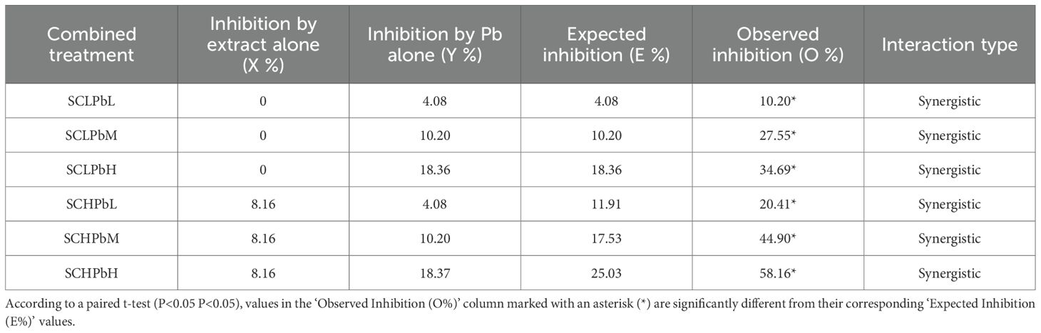 The nature of the interaction between the A. tauschii extract and Pb was determined using Colby’s method (Colby, 1967). The expected inhibition (E) for each combined treatment was calculated using the following formula, assuming an additive effect: