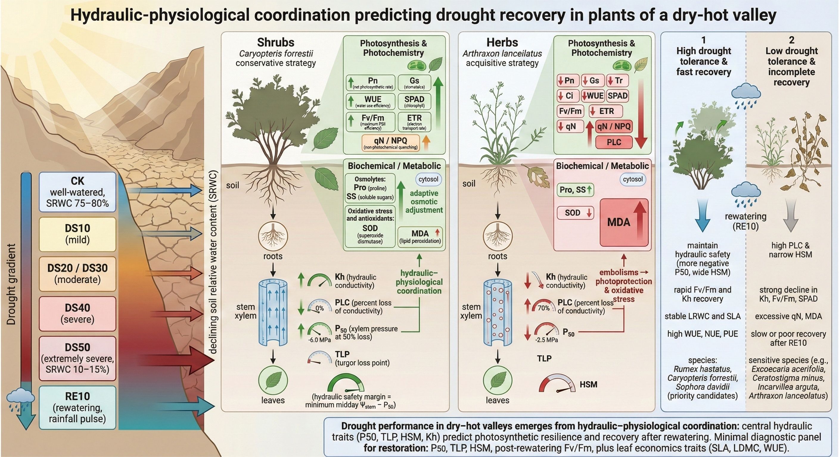 Using a controlled drought gradient followed by rewatering, we show how ten representative dry–hot valley species coordinate hydraulics, physiology, photosynthesis, and nutrient use. Three concise insights emerge.