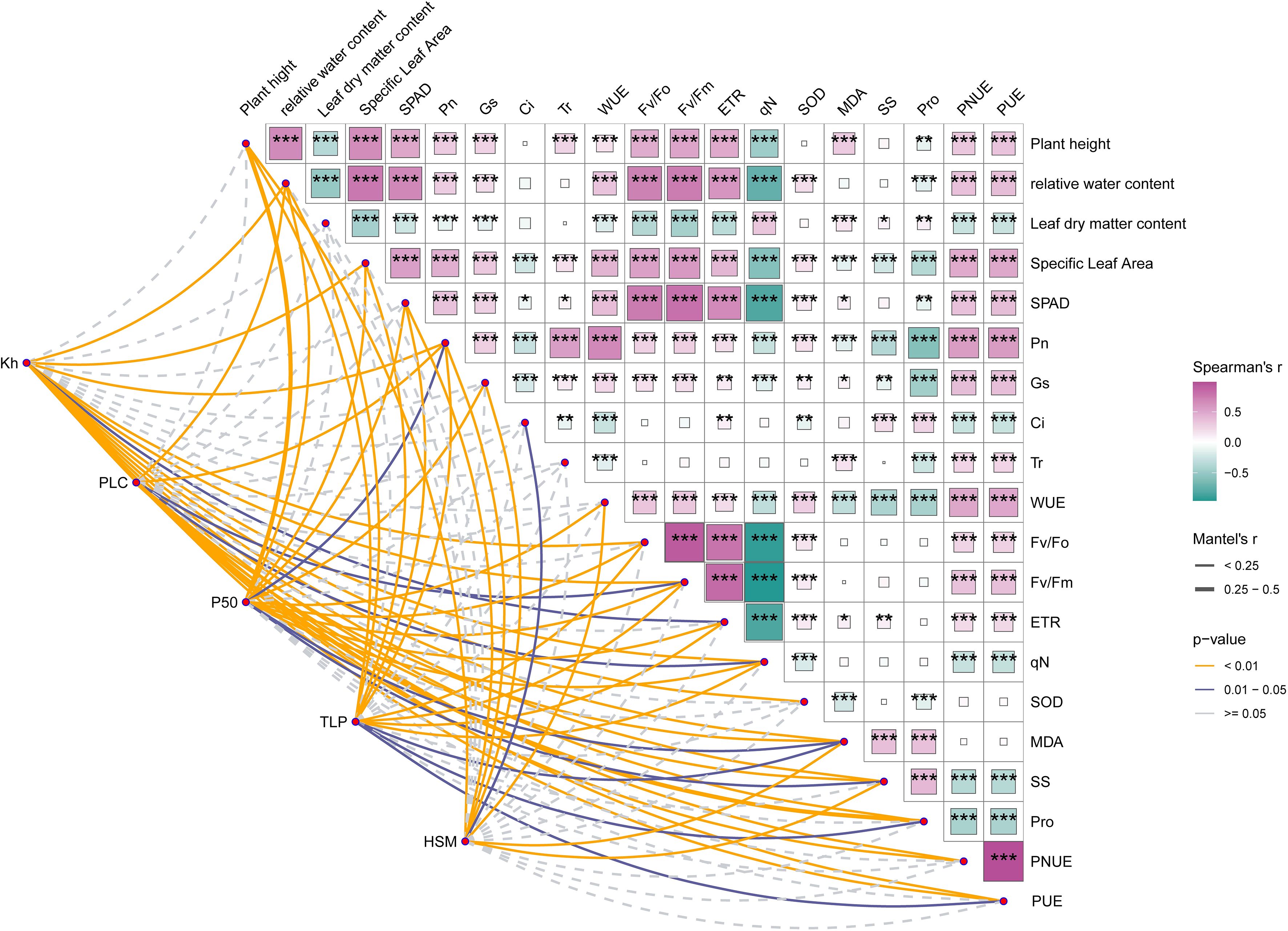 As shown in Figure 9, To quantify cross-trait coordination, we analyzed 25 drought-related indicators using Spearman rank correlations and Mantel tests. For interpretability, hydraulic thresholds are discussed with the usual convention that more negative raw P50/TLP denote greater safety; where noted, effect directions reflect that convention.