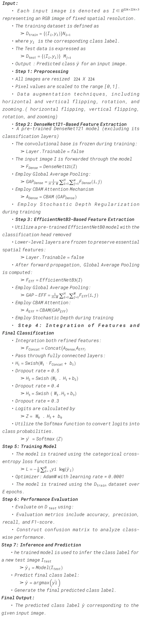 The proposed deep learning structure unites state-of-the-art CNNs and attention models to acquire high-precision classification for the given task. The structure takes DenseNet121 and EfficientNetB3 as feature extractor, both pertained on ImageNet. Both the models represent hierarchical image representations with intrinsic structural and texture-based patterns extracted from them. To reduce spatial dimensions without losing important features, GAP is applied to the extracted feature maps. To enhance feature representation, CBAM is employed. CBAM improves feature maps by applying channel attention, which provides importance weights to different feature channels, and spatial attention, which highlights important regions in the input image, sequentially. This operation assists the model in focusing on the strongest features, as it improves performance in classification. For added robustness, stochastic depth regularization is employed. Stochastic depth aids in preventing model overfitting by randomly discarding feature maps during training and encourages redundancy while learning features. The features extracted by EfficientNetB3 and DenseNet121 are fused through feature concatenation, whichxunites complementary information from the two models. This integration allows the model to combine local fine-grained features from DenseNet121 with efficiently scaled features from EfficientNetB3 to provide a more discriminative feature representation.