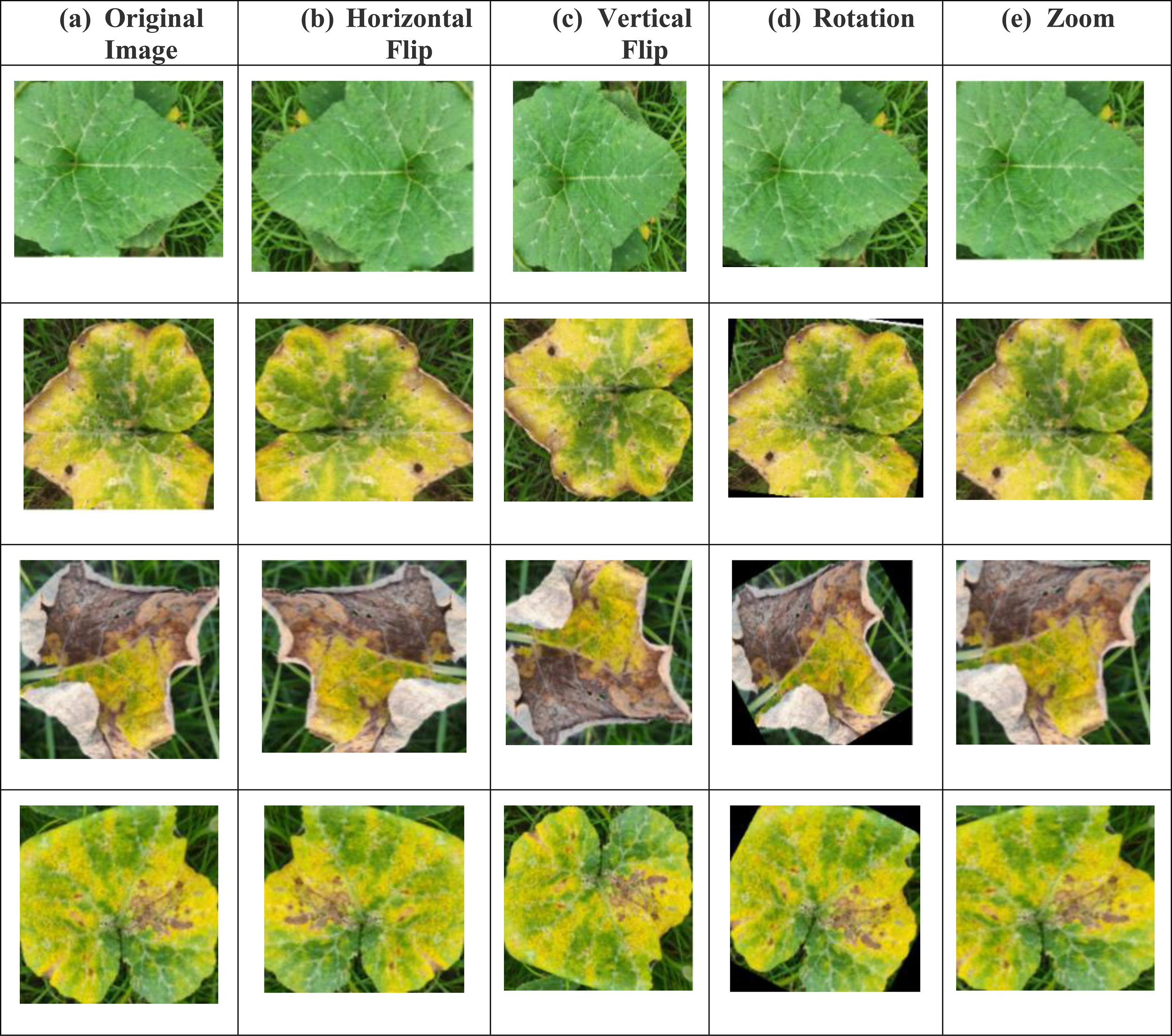 Data augmentation serves as a crucial preprocessing step to increase the diversity of the training dataset and enhance the generalization capability of deep learning models. In this study, four augmentation techniques horizontal flipping, vertical flipping, rotation, and zooming were applied to the pumpkin leaf images to artificially expand the dataset and simulate realistic variations encountered in agricultural field environments. These geometric transformations mimic changes in leaf orientation, camera angle, and scale, enabling the model to learn feature invariances and reducing the risk of overfitting. Importantly, augmentation was applied only to the training set, while validation and test sets were kept unchanged to ensure unbiased model evaluation. The following augmentation operations were utilized: