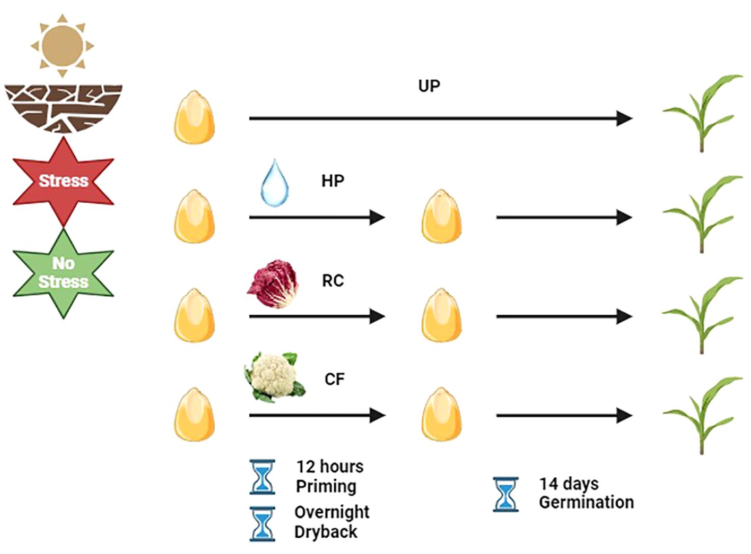 Figure 1. Schematic representation of the experimental system (https://www.biorender.com/). UP, unprimed; HP, hydropriming; RC, priming with red chicory extract; CF, priming with cauliflower extract.