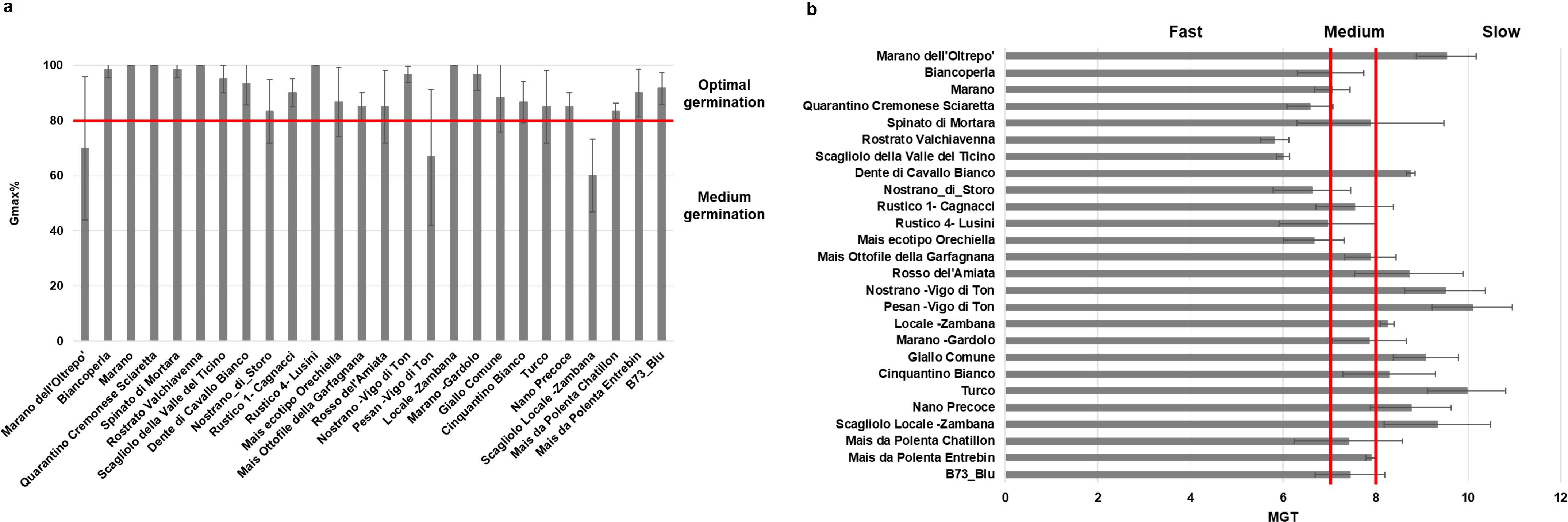 Figure 2. Germination performance of 26 Italian maize varieties under optimal growth conditions. (a) Germination percentage (G%). (b) Mean germination time (MGT). Data is presented as means ± standard deviations of three independent replicates.