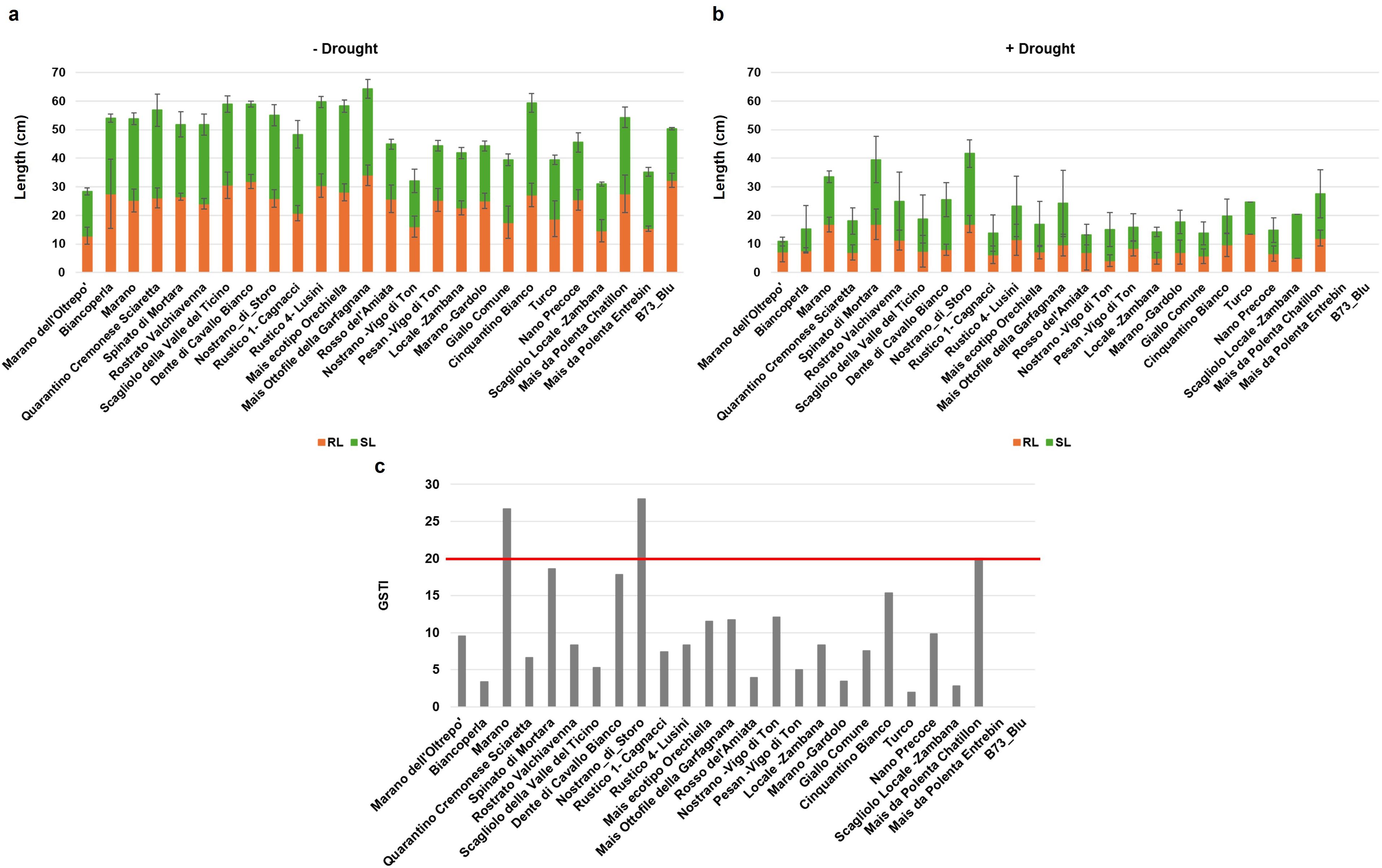 Figure 3. Seedling length of the 26 Italian maize varieties grown for 14 days in the soil. (a) Root length (RL) and shoot length (SL) under optimal conditions. (b) RL and SL under drought stress. Data is presented as means ± standard deviations of three independent replicates. (c) Germination stress tolerance index (GSTI). Data is presented as a ratio of means between the levels of germination under optimal and stress conditions.