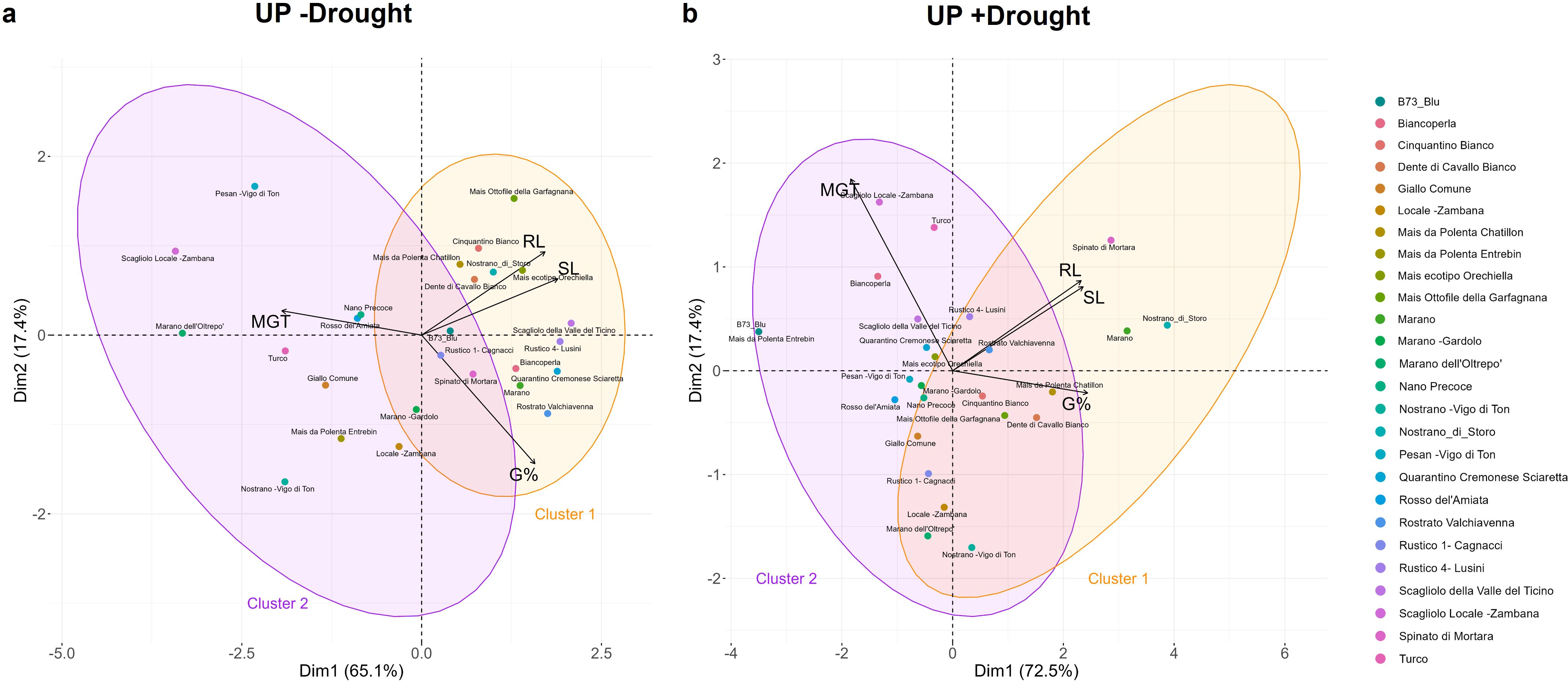 The PCA analysis conducted using all germination parameters calculated in the presence/absence of drought allowed to differentiate the genotypes in two clusters. In the absence of stress (Figure 4a), the PCA score plot, explaining 82.5% (65.1% for Dim1 and 17.4% for Dim2) of the variance between parameters, point at two clusters separated based on optimal (cluster 1 in orange) or medium (cluster 2 in purple) germination classes. Similarly, the two classes obtained in the presence of drought (Figure 4b), distinguishes the genotypes based on their tolerance (cluster 1) or susceptibility (cluster 2) to the stress during germination. The contribution of each of the germination variables to this distinction, is reported in the supplementary data (Supplementary Table 5).