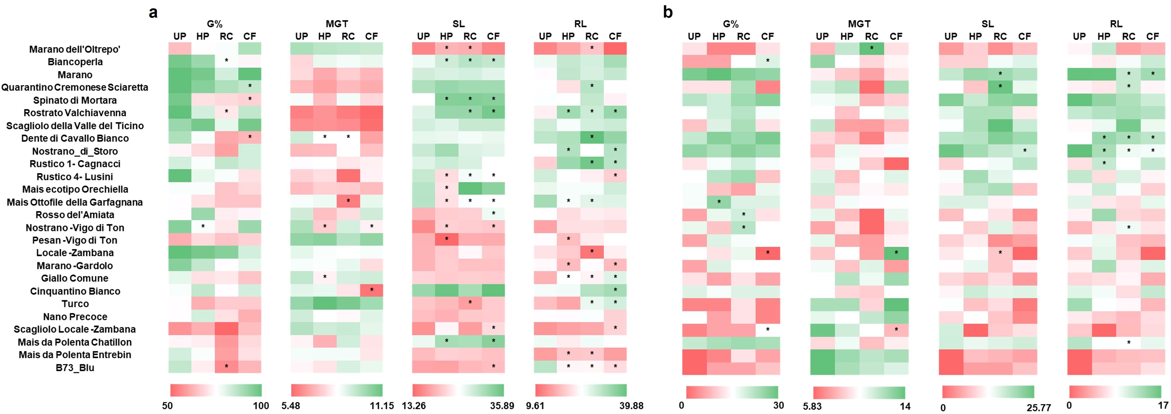 Figure 5. Effect of seed priming on the germination parameters of the 26 Italian maize verities investigated. (a) Germination parameters in the absence of stress. (b) Germination parameters in the presence of drought stress. Data is presented as a heatmap based on the means values obtained from three independent replicates. Asterisks indicate statistically significant differences (*p ≤ 0.05) to each respective UP control. G%, germination percentage; MGT, mean germination time; SL, shoot length; RL, root length; UP, unprimed; HP, hydropriming; RC, priming with red chicory extract; CF, priming with cauliflower extract.