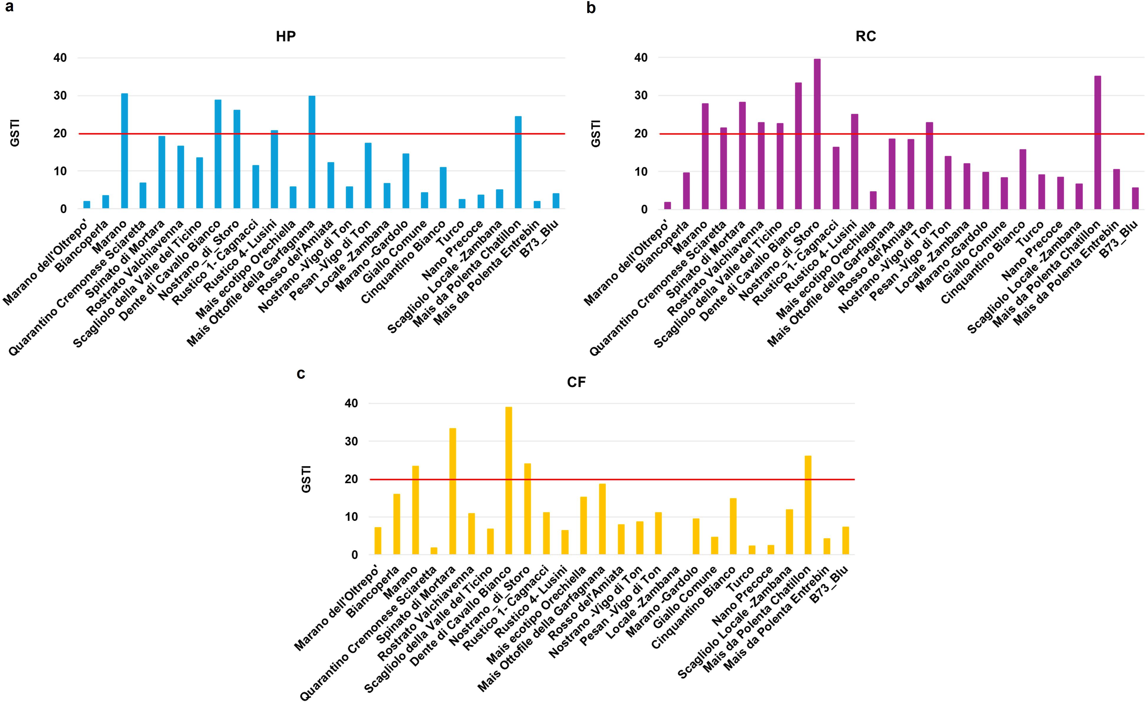 Given that GSTI proved a relevant parameter to distinguish between tolerant and susceptible varieties, we used it also to evidence the impact of the seed priming in response to drought (Figure 6). The obtained data evidenced that more varieties were able to cross the 20% GSTI threshold after priming. Following HP, three additional genotypes (Mais Ottofile della Garfagnana, Dente di Cavallo Bianco, Rustico 4-Lusini) showed increased tolerance to drought (Figure 6a). The RC treatment was the one with the highest number of responsive varieties, reaching to a maximum of seven (Dente di Cavallo Bianco, Spinato di Mortara, Rustico 4-Lusini, Rostrato Valchiavenna, Nostrano -Vigo di Ton, Scagliolo della Valle del Ticino, Quarantino Cremonese Sciaretta) (Figure 6b). Differently, the CF priming resulted in only two other genotypes (Dente di Cavallo Bianco, Spinato di Mortara) crossing the 20% threshold (Figure 6c).