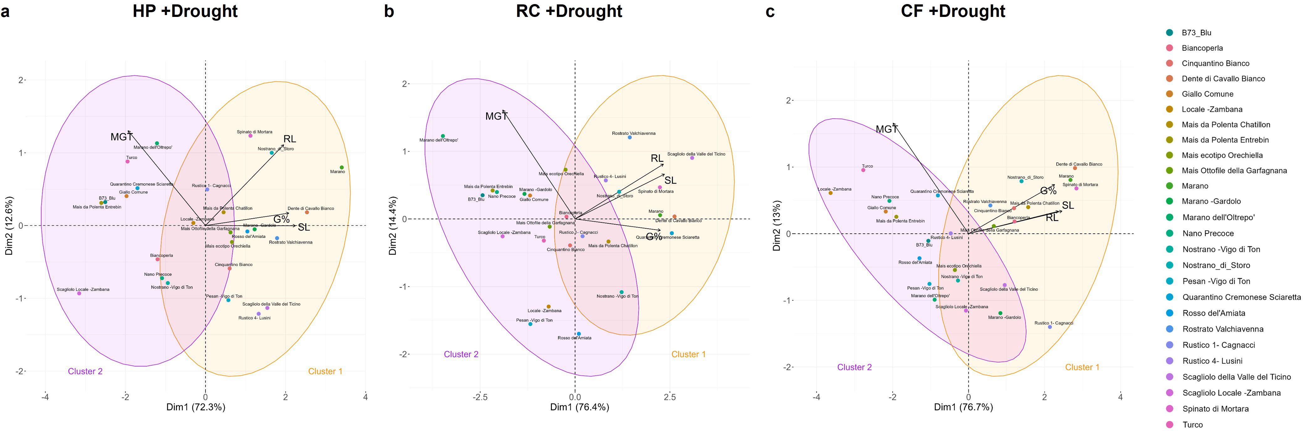 Figure 7. Principal component analysis (PCA) following priming treatments in the presence of drought stress. (a) HP, hydropriming. (b) RC, priming with red chicory extract. (c) CF, priming with cauliflower extract. G%, germination percentage; MGT, mean germination time; SL, shoot length; RL, root length.