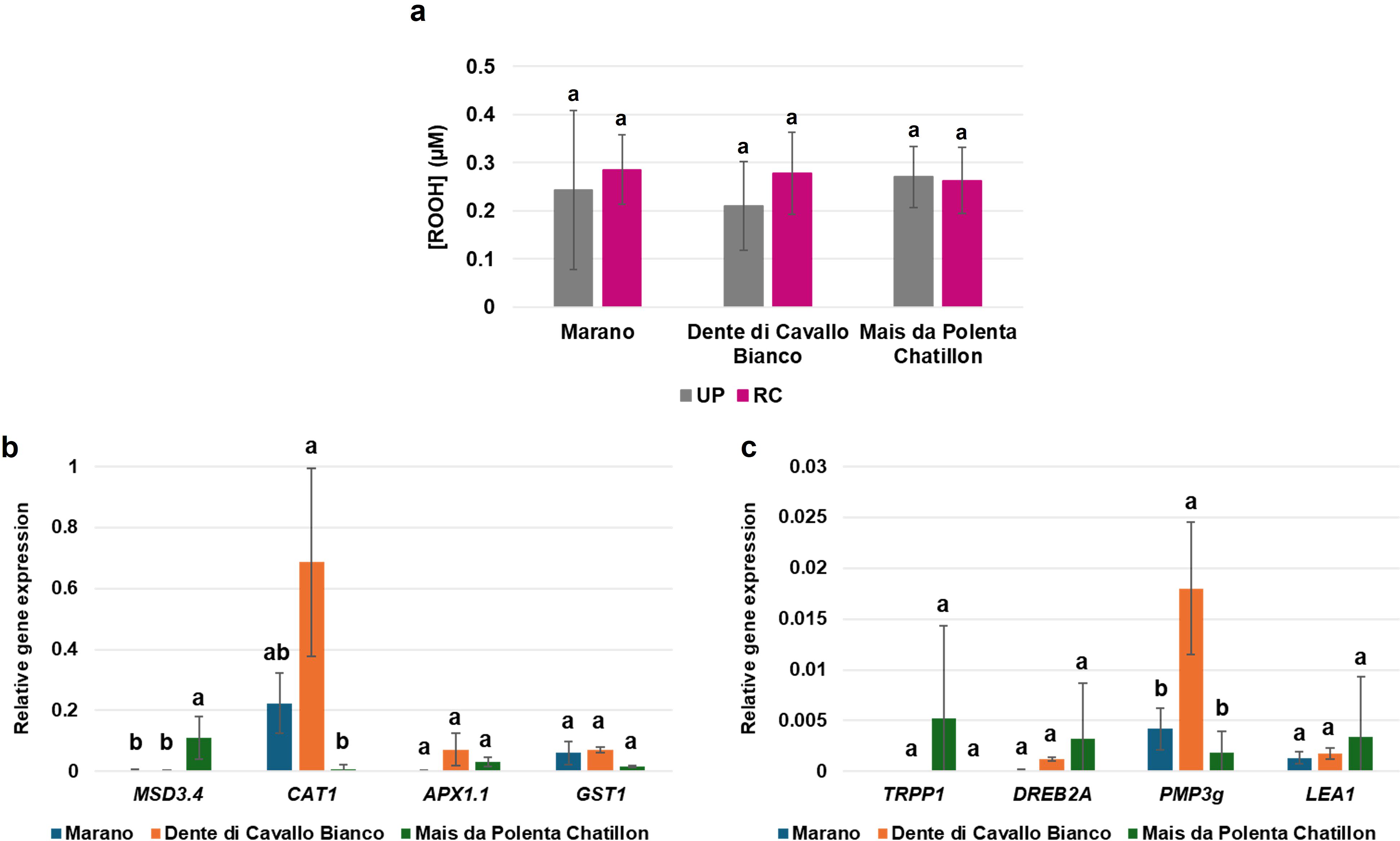 Figure 8. ROS release and gene expression data in dry seeds from Marano, Dente di Cavallo Bianco and Mais da Polenta Chatillon varieties. (a) ROS levels in terms of [ROOH] released from seeds. (b) Relative expression patterns of genes involved in antioxidant mechanisms. (c) Relative expression patterns of genes involved in drought related mechanisms. Data is presented as means ± standard deviations of three independent replicates. Statistical significance (p ≤ 0.05) is indicated by the occurrence of different letters, as determined through one-way ANOVA and Tukey’s test. UP, unprimed; RC, priming with red chicory extract; MSD3.4, Mn-superoxide dismutase 3.4; CAT1, catalase 1; APX1.1, ascorbate peroxidase 1.1; GST1, glutathione-S-transferase 1; TRPP1, trehalose-6-phosphate phosphatase 1; DREB2A, Dehydration-responsive element-binding 2A; PMP3g, plasma membrane proteolipid 3g; LEA1, late embryogenesis abundant protein 1.