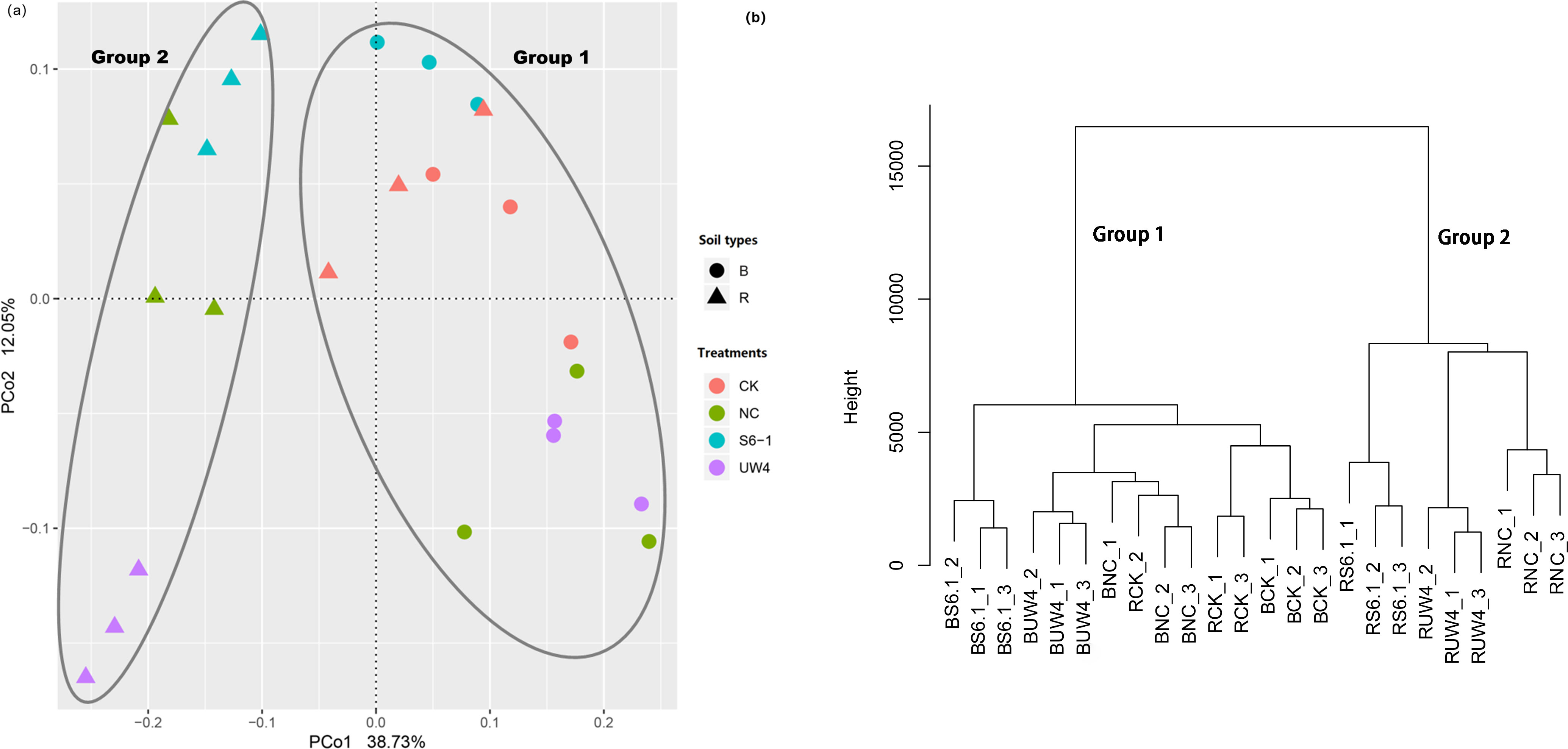 Figure 2. (a) Principle coordinates analysis (PCoA) and (b) cluster analysis derived from Bray-Curtis distance matrix, based on the relative abundances of the bacterial OTUs. The values of axes 1 and 2 are the percentages that can be explained by the corresponding axis. B, bulk soil; R, rhizosphere. S6-1, inoculation with the PGPB strain B. anthina S6-1; UW4, inoculation with the PGPB strain Pseudomonas putida UW4; NC, inoculation with the non-PGPB strain P. fluorescens ATCC17400; CK, non-inoculated control.