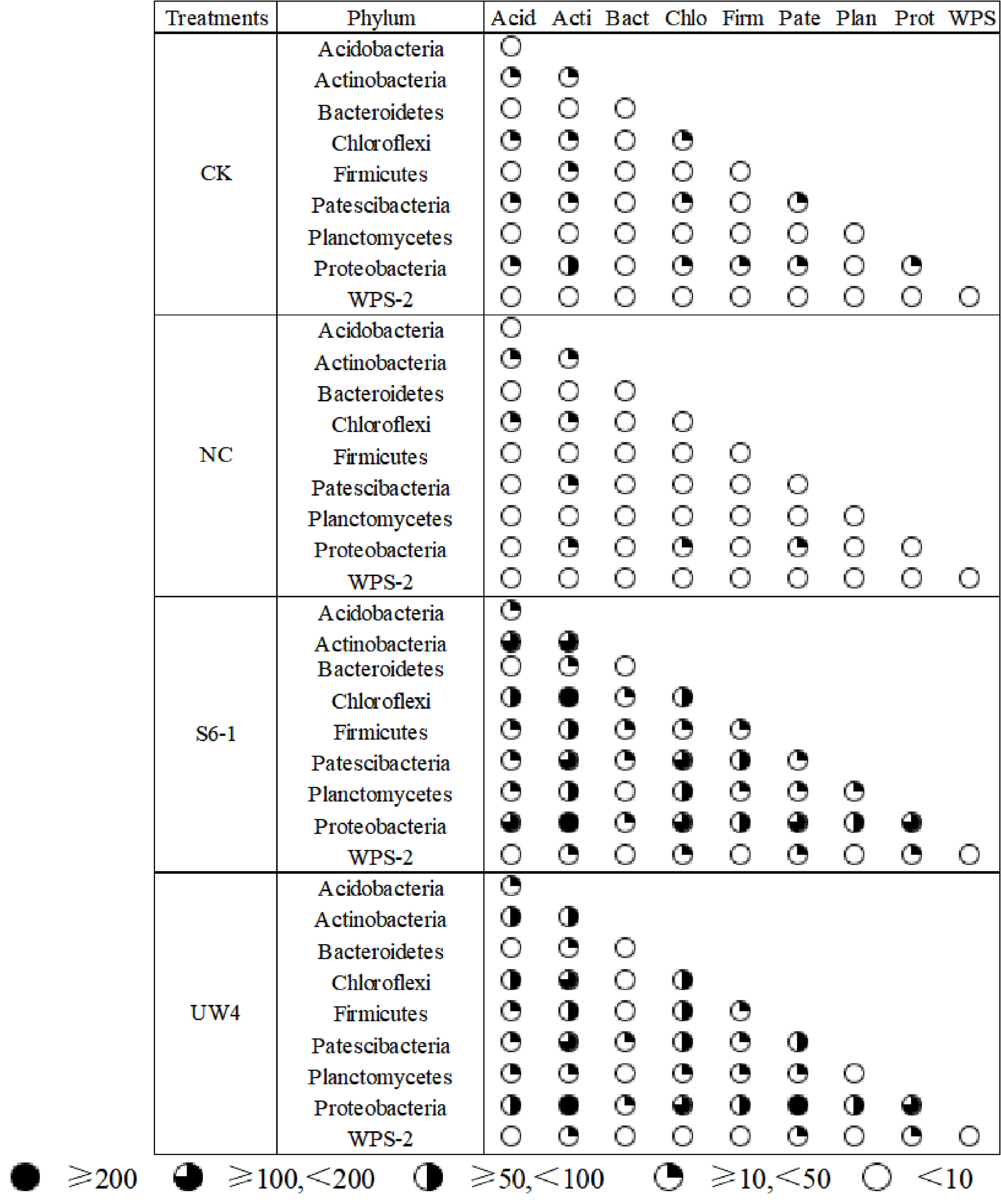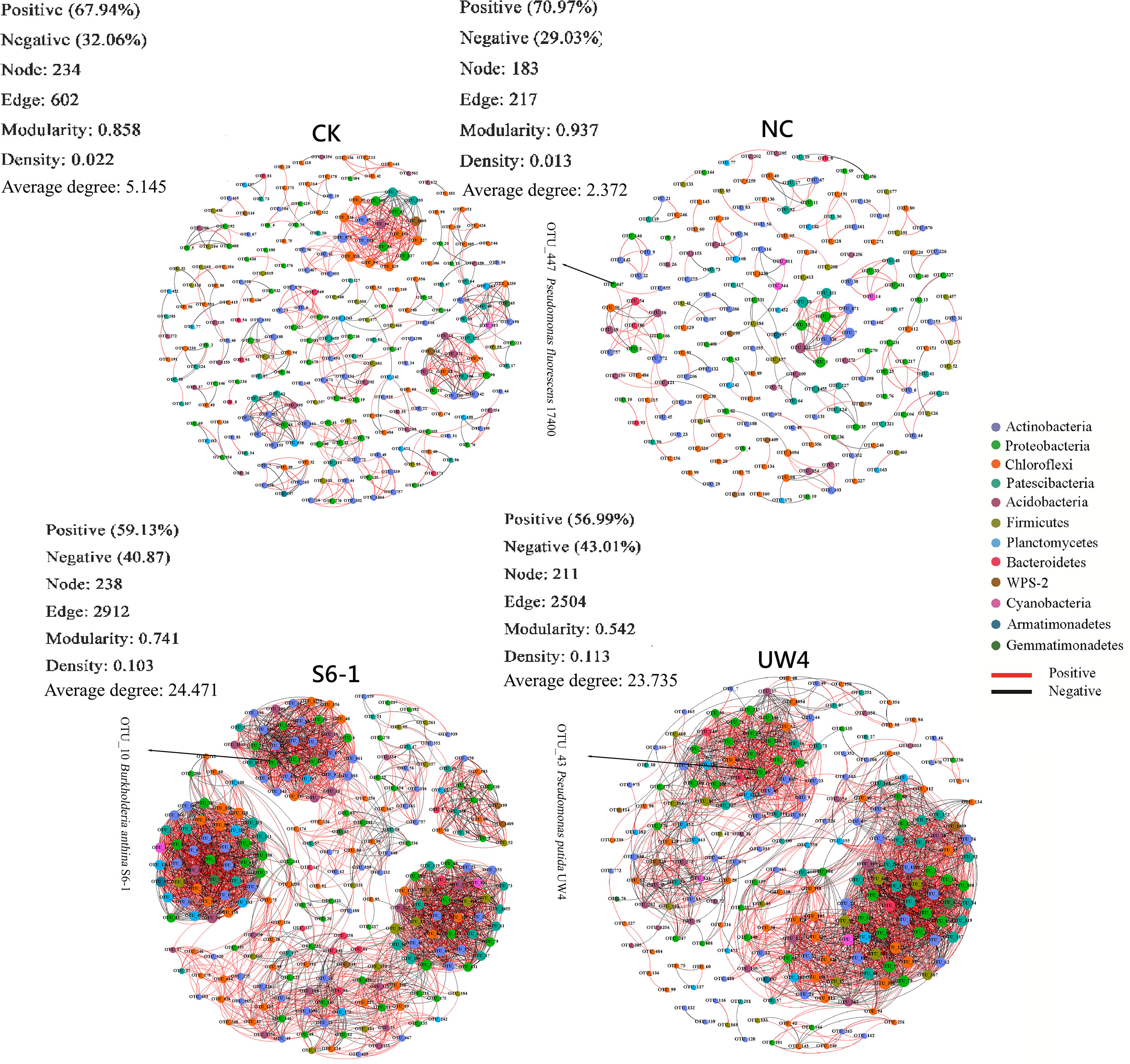 Most nodes (97.27%-98.72%) in the networks for all four treatments were assigned to 9 bacterial phyla, including Acidobacteria, Actinobacteria, Bacteroidetes, Chloroflexi, Firmicutes, Patescibacteria, Planctomycetes, Proteobacteria and WPS-2. PGPB inoculation significantly enhanced the associations within and among these bacterial phyla, as compared to the CK and NC treatments (Figure 5). In addition, the networks for S6–1 and UW4 had more negative correlations (40.87% and 43.01%, respectively) than CK (32.06%) or NC (29.03%) networks. These results revealed that the bacterial community of S6–1 and UW4 had more complex and compact associations than CK and NC.