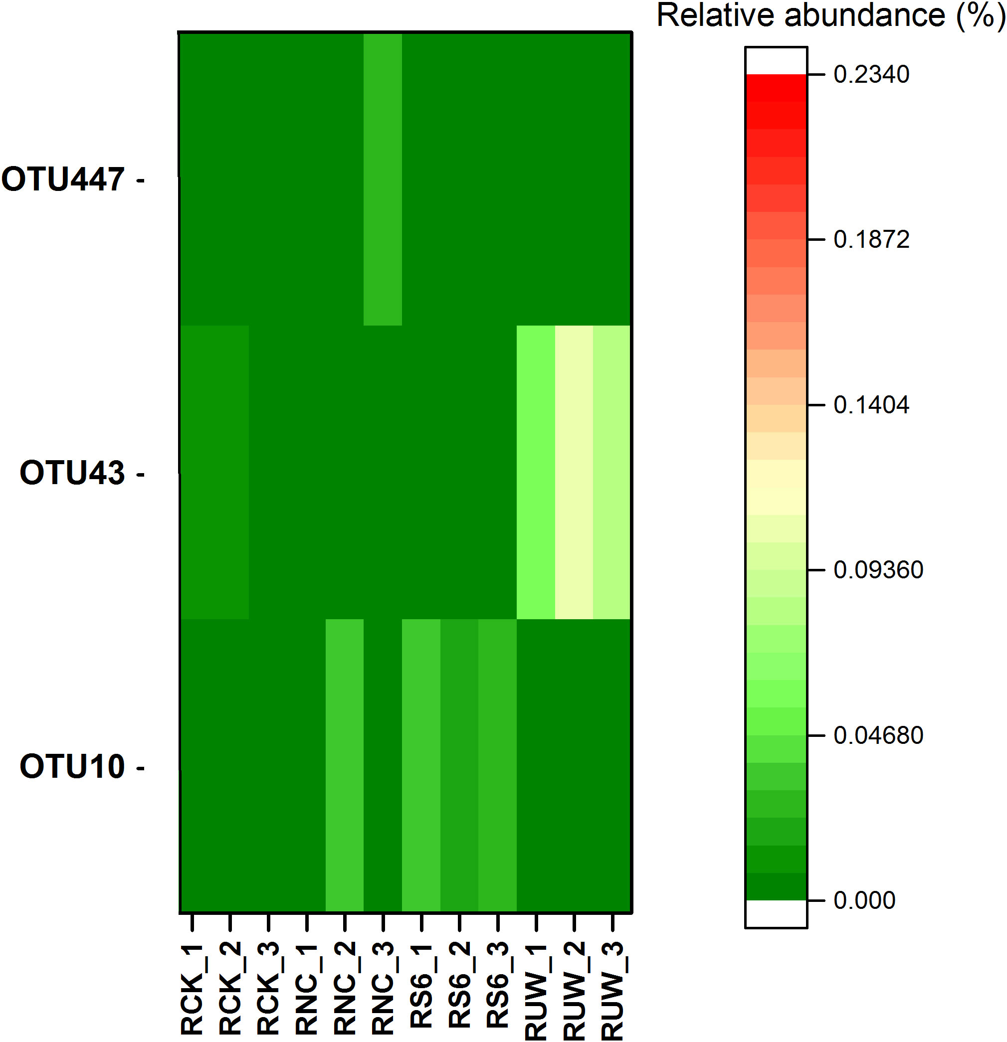 To track the survival of the inoculated strains, we further identify the OTUs that perfectly matched the 16S rRNA gene sequence of the inoculated strains. The results showed that OTU10, OTU43, and OTU447 could perfectly match the 16S rRNA gene sequence of B. anthina S6-1 (99.56% similarity), P. putida UW4 (99.56% similarity) and P. fluorescens ATCC17400 (99.78% similarity), respectively. Furthermore, the inoculation of P. putida UW4 and B. anthina S6–1 significantly elevated the relative abundance of OTU43 and OTU10, respectively, within the rhizosphere of the UW4 and S6–1 treated plants (Figure 6). These results suggested that we likely defined the actual OTUs that were previously inoculated. However, little increase was observed in the relative abundance of OTU447 in the rhizosphere under the treatment of inoculation with non-PGPB strain P. fluorescens ATCC17400.